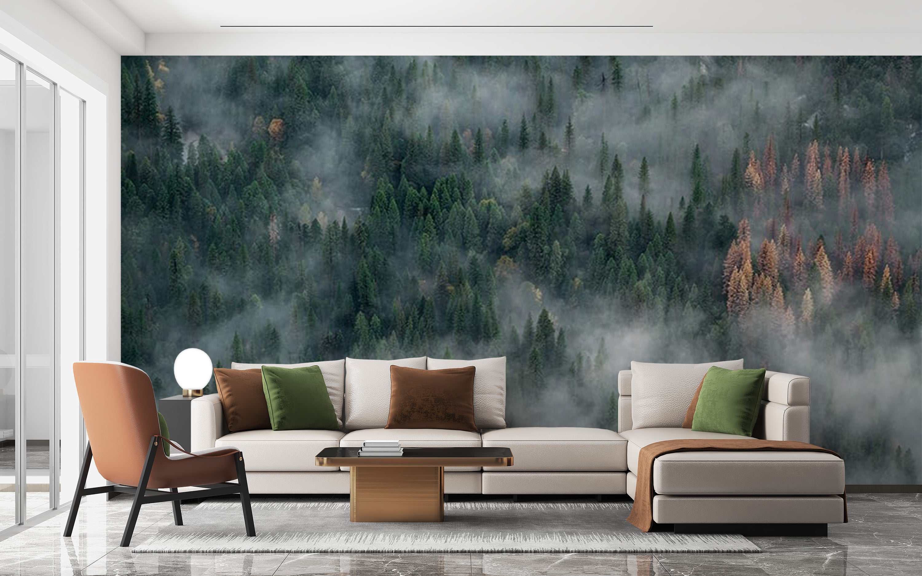 Our beautiful foggy pine forest wallpaper mural presents stillness and beauty of the nature. It use shades of deep green and mild whiteness together to recreate a magical look for foggy jungle. Living room theme: nature tall pine tree branches are the epitome of nature with its precision too accurate to be ignored, creating an ambience that makes you feel right where in a forested area and taking deep breaths of fresh crisp air. Well, as for us, we make this wall green with the upmost resolution and detailing that proves our quality servicing along with being aesthetically pleasant. Its soft, misty glow enchants and tranquilizes any room it touches. The serene mural for your office coffee corner or peaceful sanctuary in the house. Discover the hug of nature and bring elegance with peace in your area using our pine forest foggy wallpaper.
