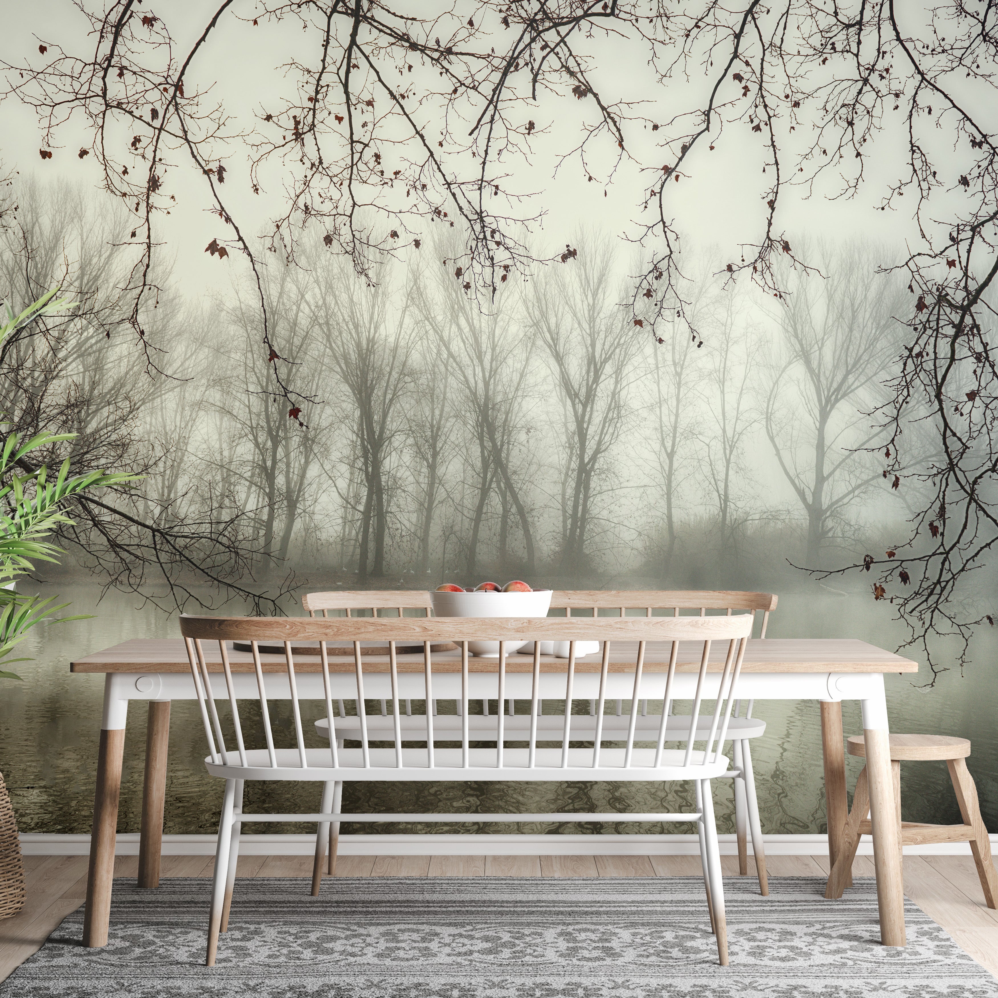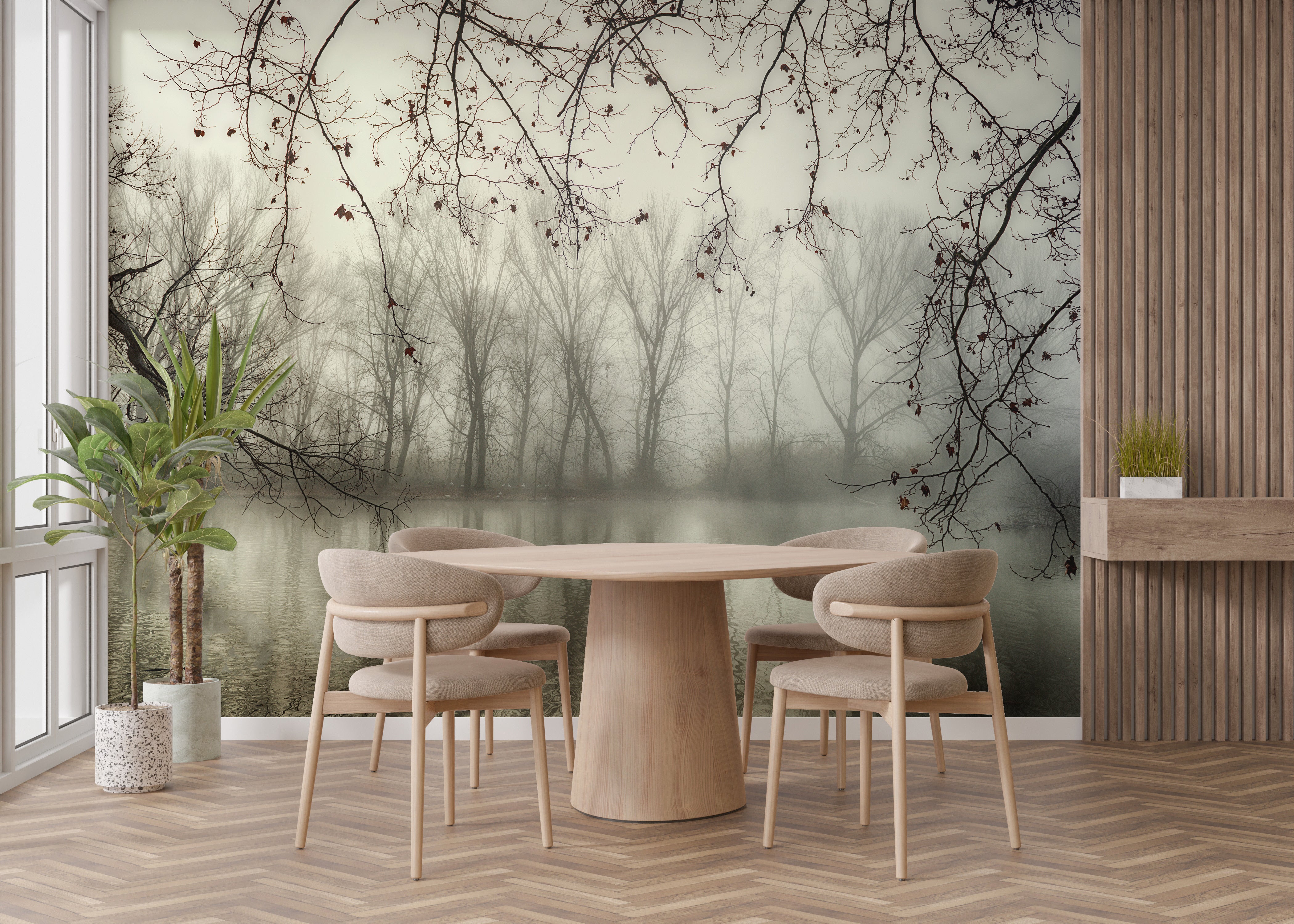 As you gaze at the foggy forest reflection inside the river mural wallpaper, you can't help but feel a sense of wonder and calm. The intricate details of the forest, with its lush green trees and misty fog, are beautifully reflected in the serene river below. This wallpaper is the perfect addition to any living room looking to add a touch of nature and serenity to their space. With its unique combination of forest and river wallpaper, this mural is sure to transport you to a peaceful and tranquil state of mind. Let the beauty of nature come alive in your home with this unique wallpaper.