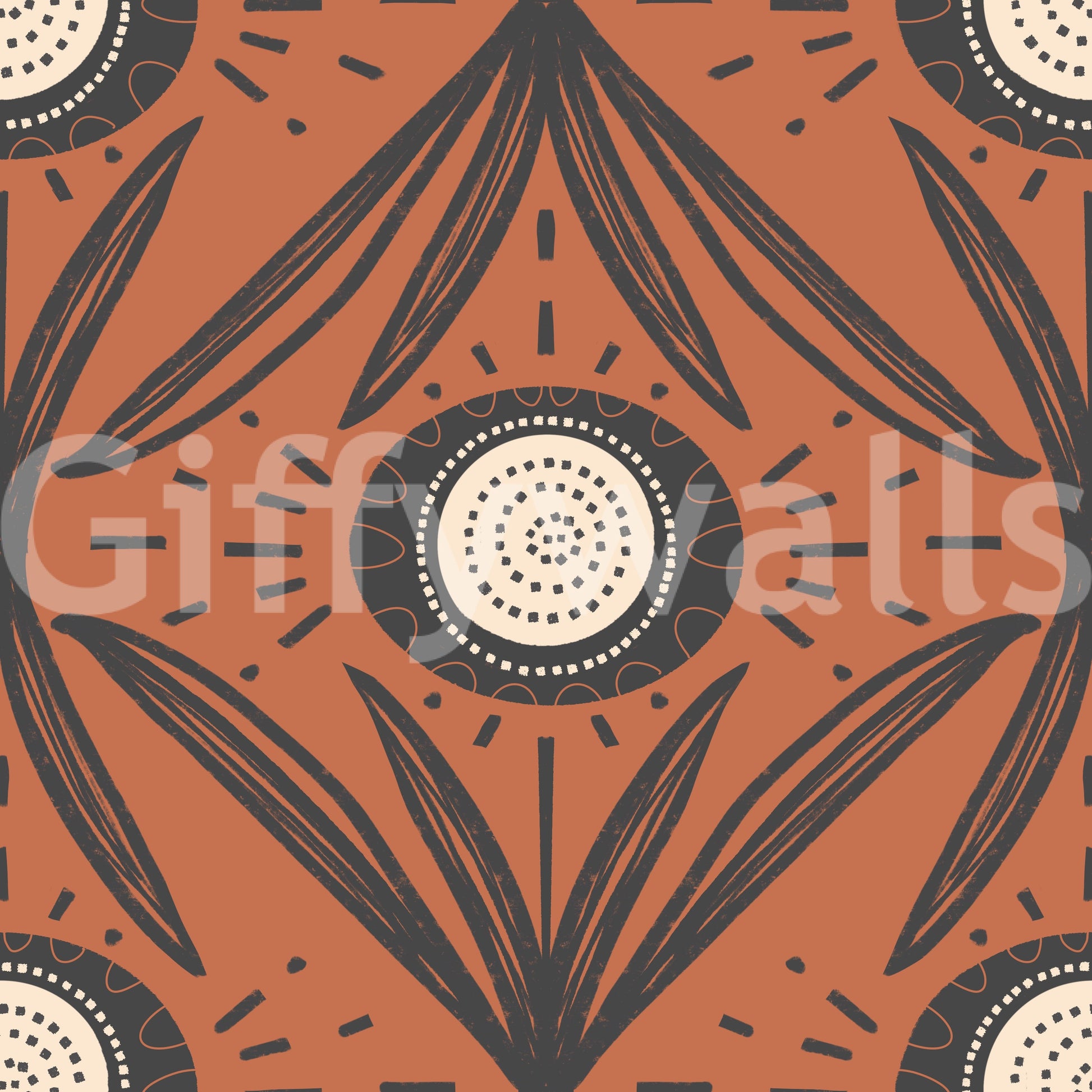 Evoking a sense of nostalgic charm, this 'Folk Bloom Radiance' wallpaper features a captivating retro contrast floral pattern. Bold charcoal outlines define stylized petals and radiant sun-like blossoms against a warm terracotta backdrop, creating a visually striking and inviting design. The folk-inspired motifs bring a touch of artisanal beauty, while the contrasting colors add a modern edge. This wallpaper balances rustic appeal with contemporary aesthetics, making it perfect for adding a touch of warmth and character to any space.