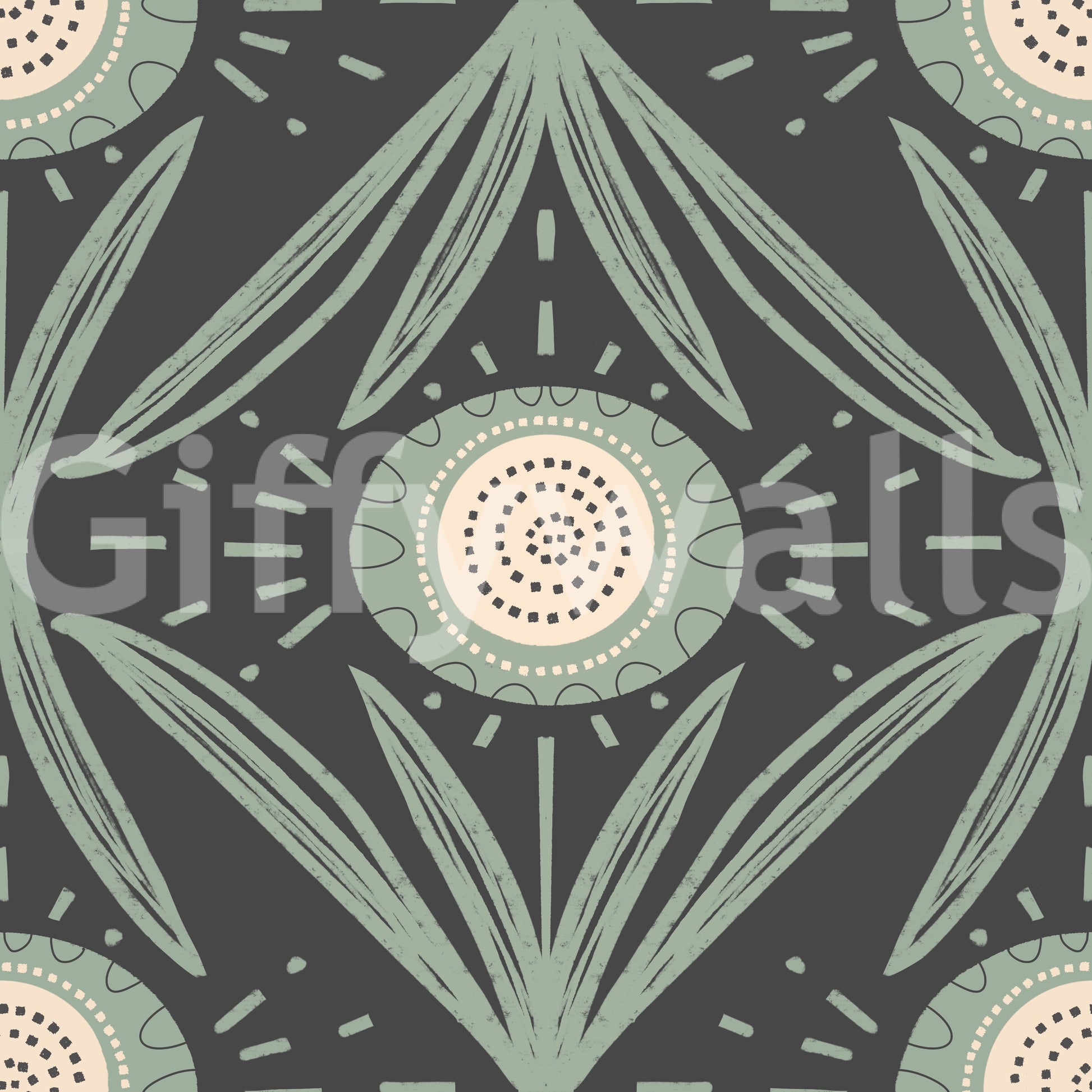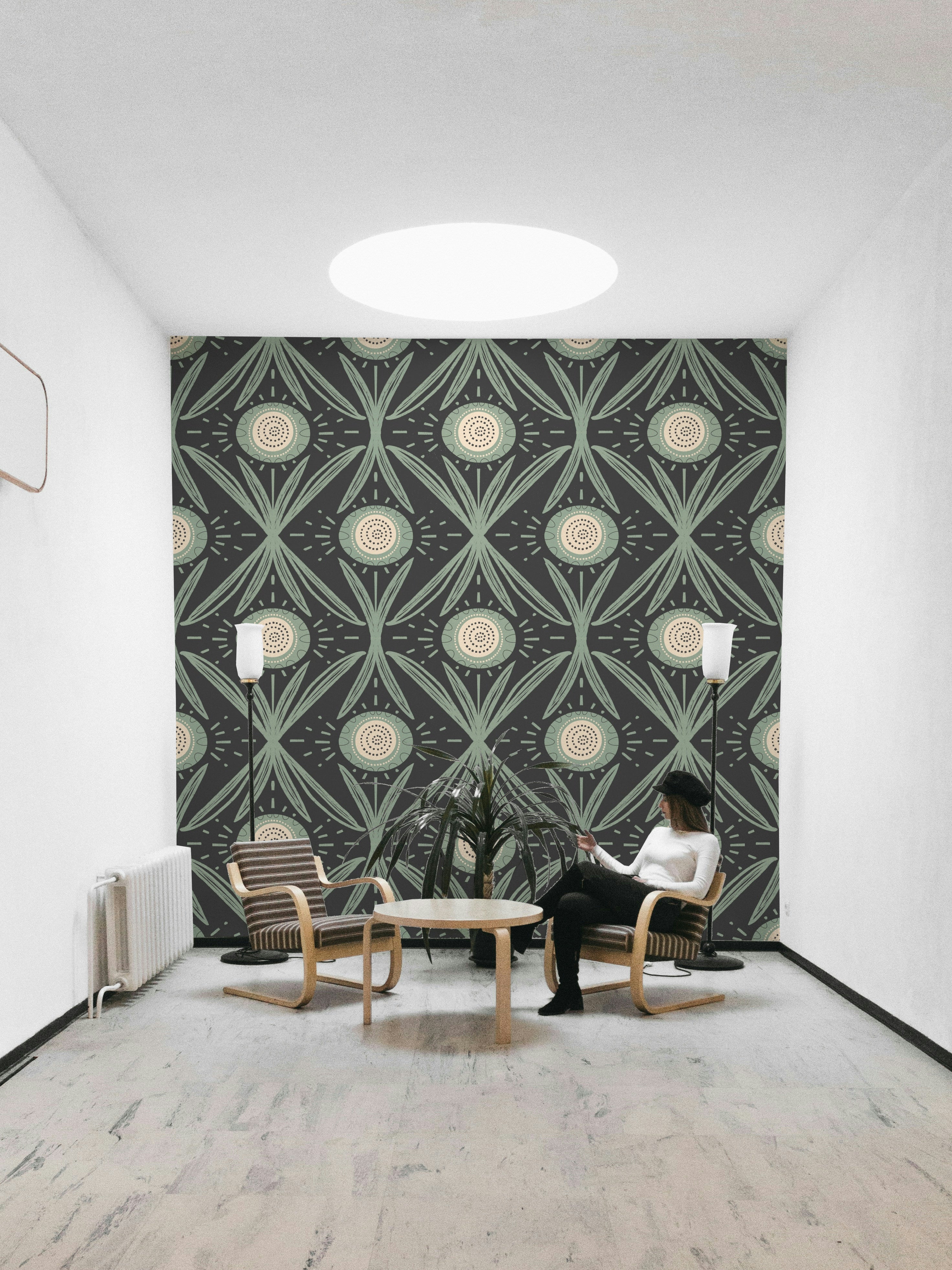 Bold floral mural wallpaper in sage and charcoal