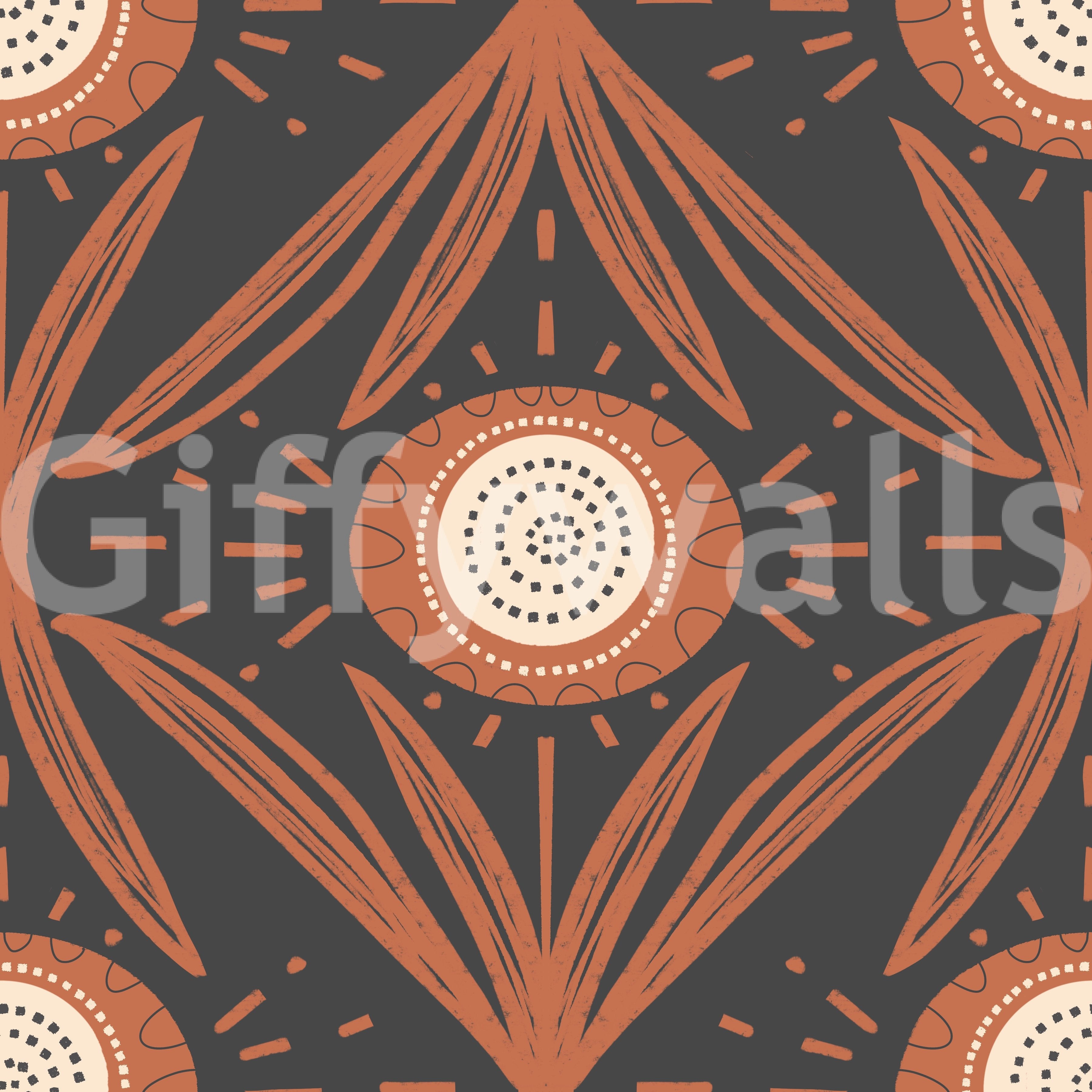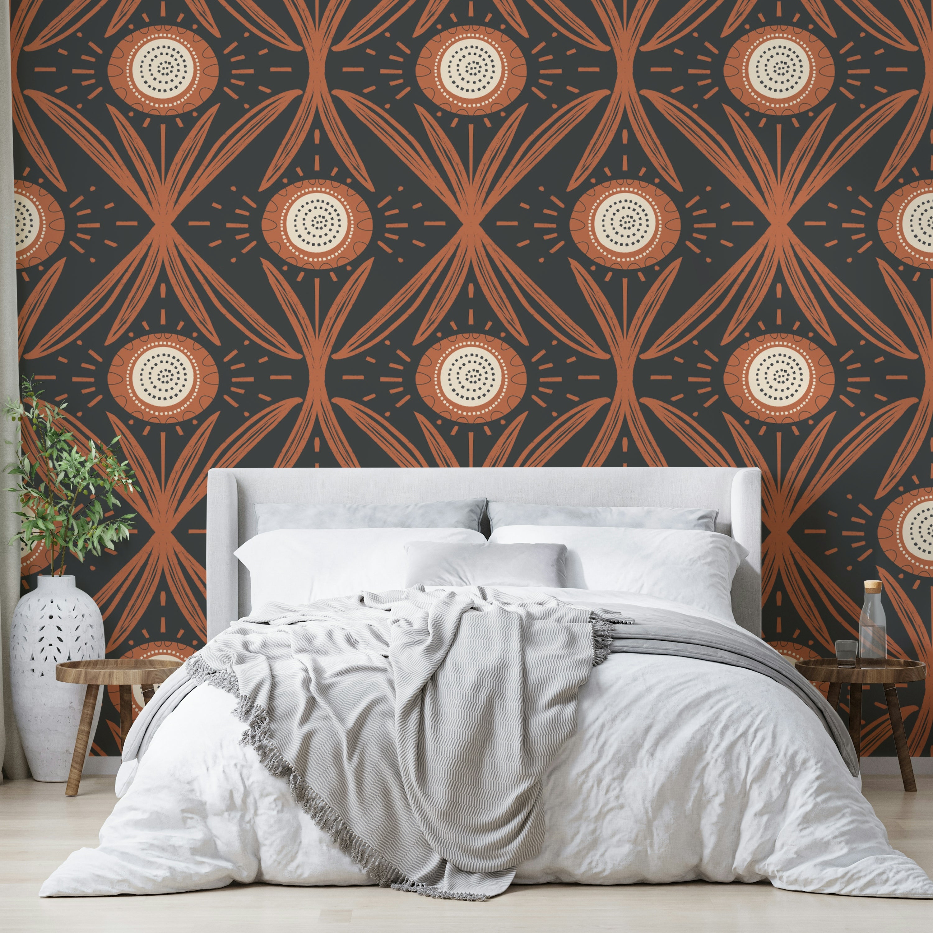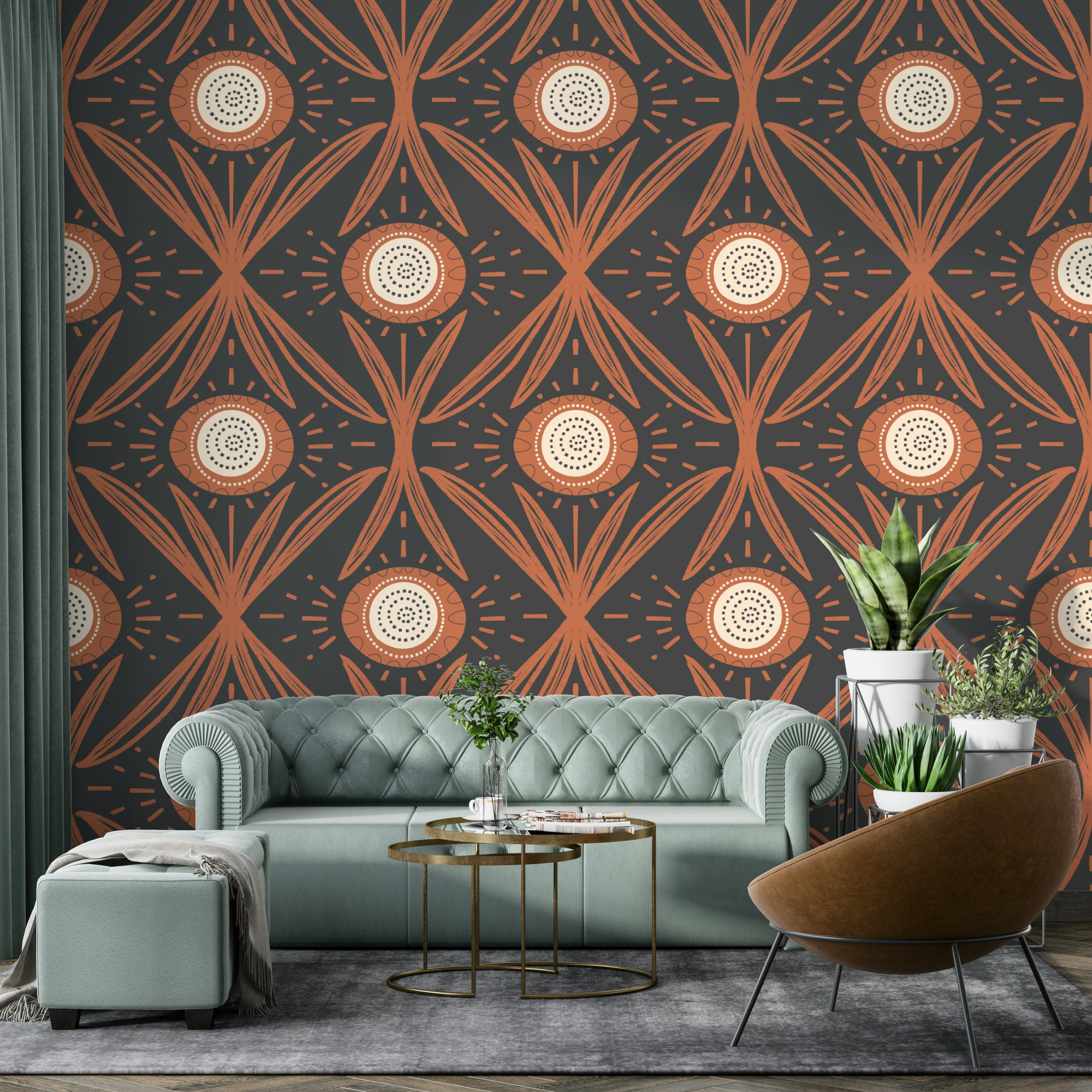 Embrace the warmth of "Folk Bloom Radiance," a Mid-Mod floral wallpaper where terracotta blooms dance against a charcoal backdrop. Evoking a handcrafted feel, the design features stylized floral motifs with radiant bursts, suggesting both botanical forms and abstract suns. The terracotta hues offer an earthy, grounded energy, while the charcoal adds a touch of modern sophistication. This pattern captures the essence of folk art reimagined through a mid-century modern lens, bringing a sense of radiant bloom and rustic charm to any space.
