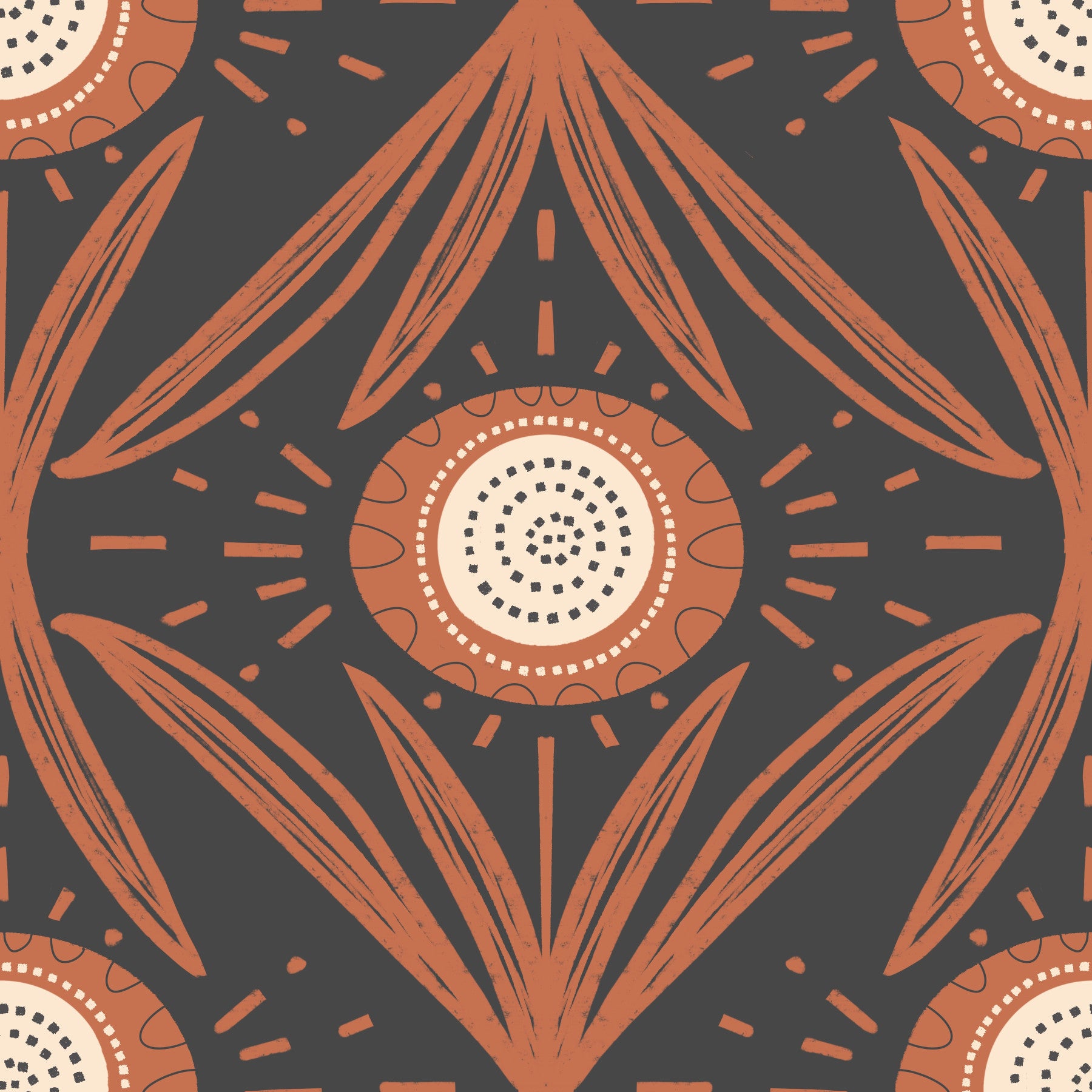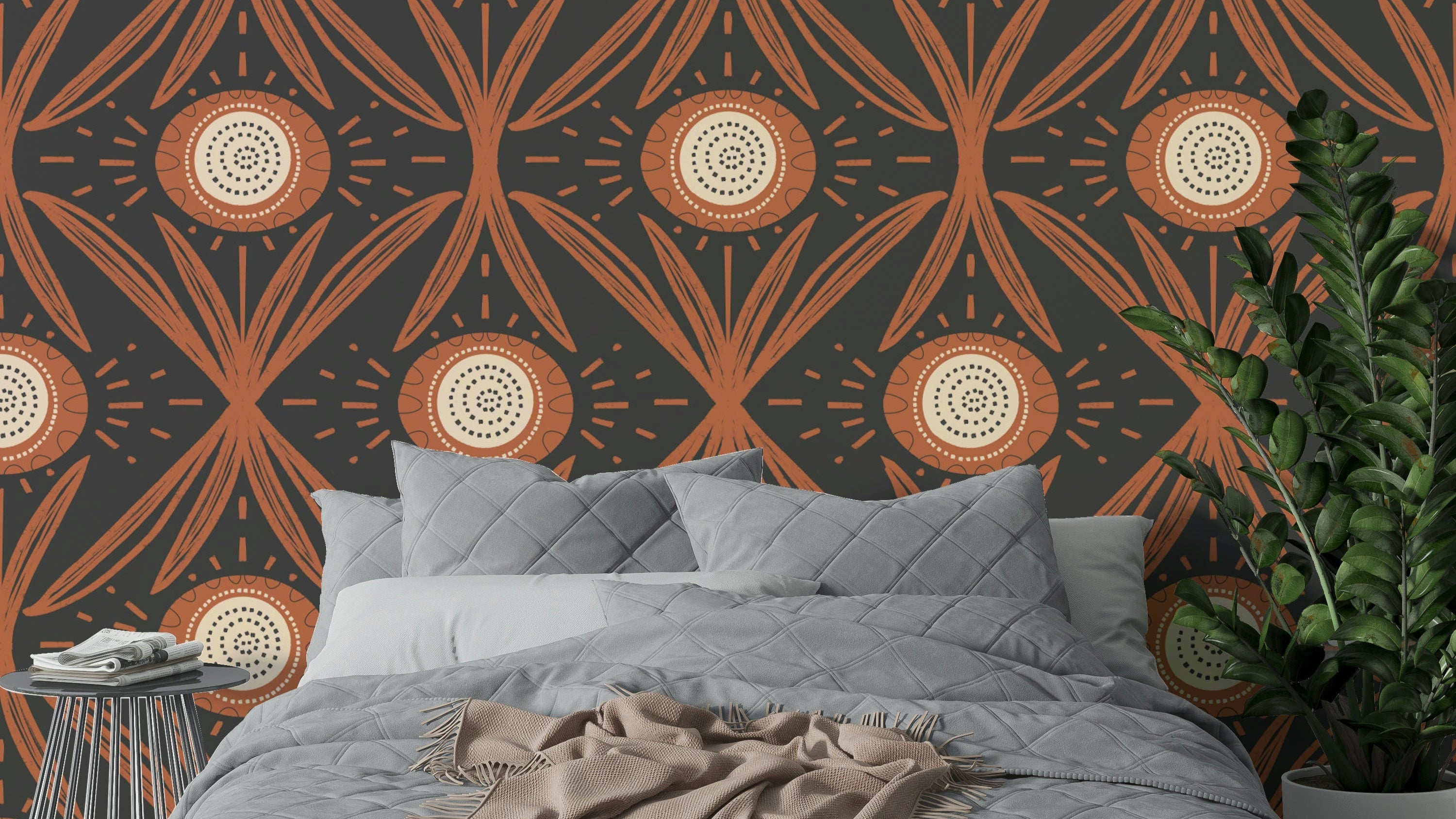 Folk Bloom Radiance Terracotta Charcoal wallpaper design