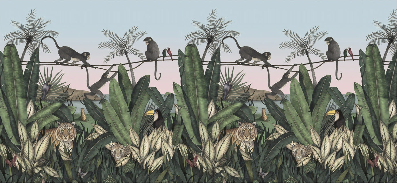 If you want to bring a touch of the wild to your home, look no further than the Nature's Haven mural wallpaper. This stunning wallpaper captures the essence of nature with its lush greenery, cascading waterfalls, and vibrant wildlife. Perhaps the most eye-catching element of this wallpaper is the playful monkeys swinging from tree to tree, adding a lively touch to any room. Our nature wallpaper brings a sense of serenity and a touch of the exotic into your home, making it the perfect way to spruce up your space with a unique and eye-catching feature.