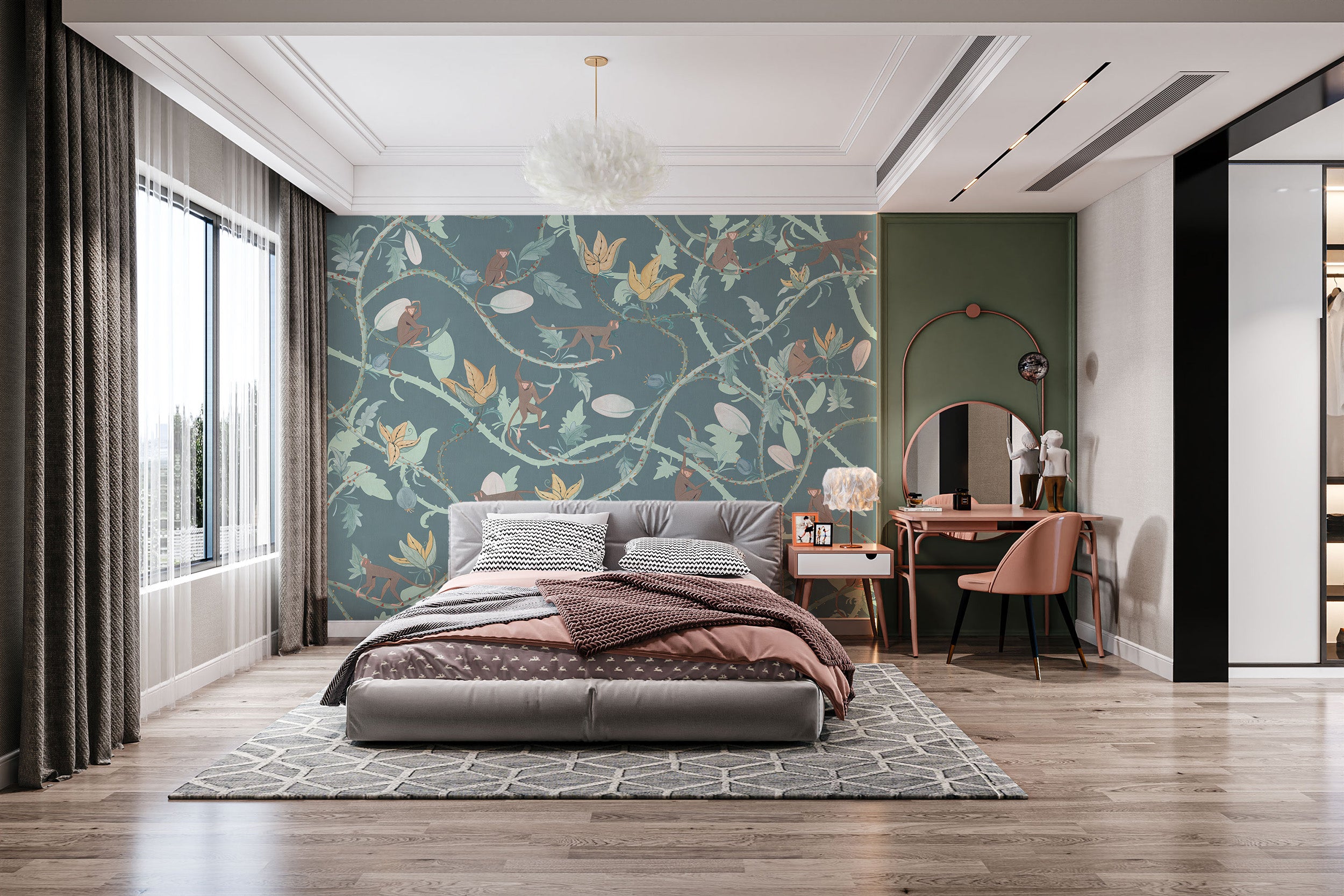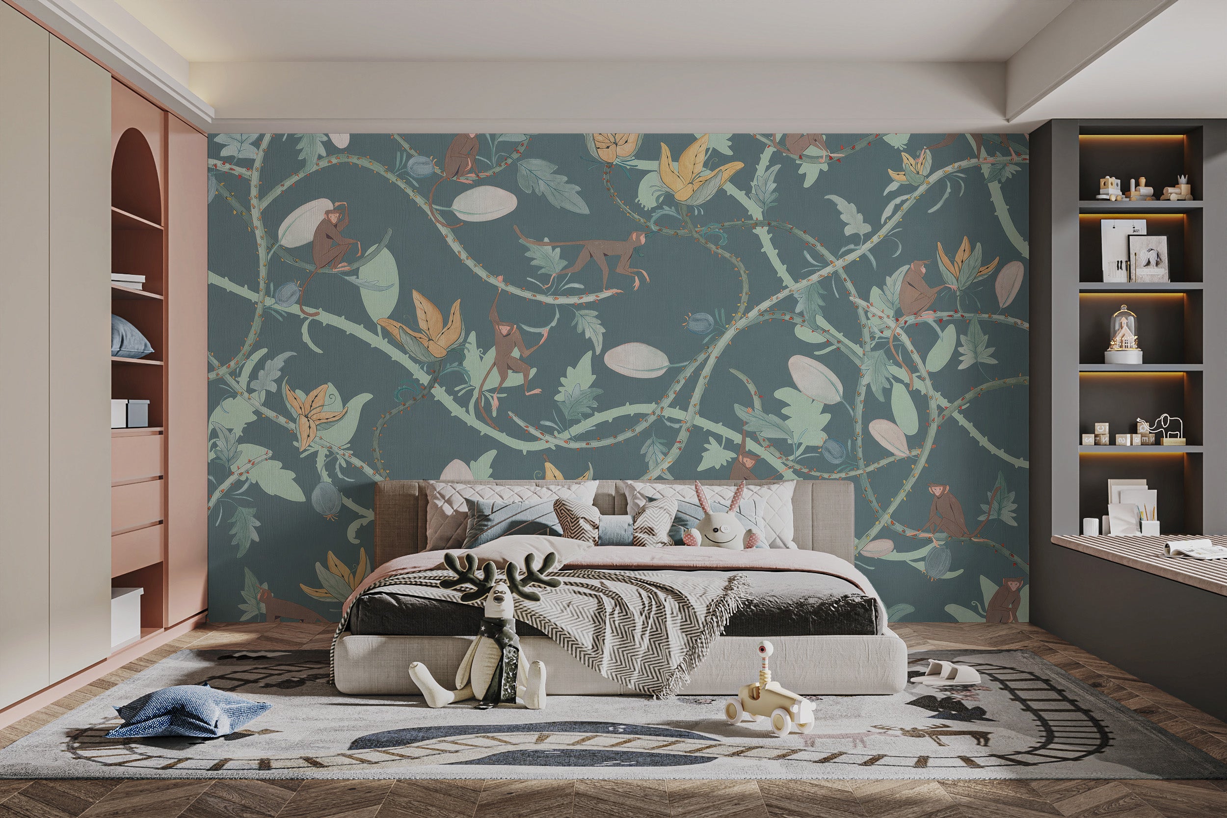 Whisk yourself into a fantasy land where the forest frolics with forest creatures amidst lush foliage. You will surely be making a peaceful haven with this charming forest pattern wallpaper. Exceptionally suitable for the nature-inspired bedroom wallpaper, it brings a little bit of the wild within your abode. As merry monkeys, sneaky foxes, and playful deer become your silent companions, each stroke is like a whispered story of this forest-themed wallpaper. Imagine lying back as those cool, dusk-like hues paint a soft canopy overhead, building a peaceful retreat where dreams are carried on the whispers of this mystical wildlife wallpaper. Suitable for dreamers and nature lovers, this forest animal wallpaper lets your bedroom be infused with the subtle wildness of the evergreen forest. This is perfect for anyone looking for the serene beauty of woodland creatures in their space.