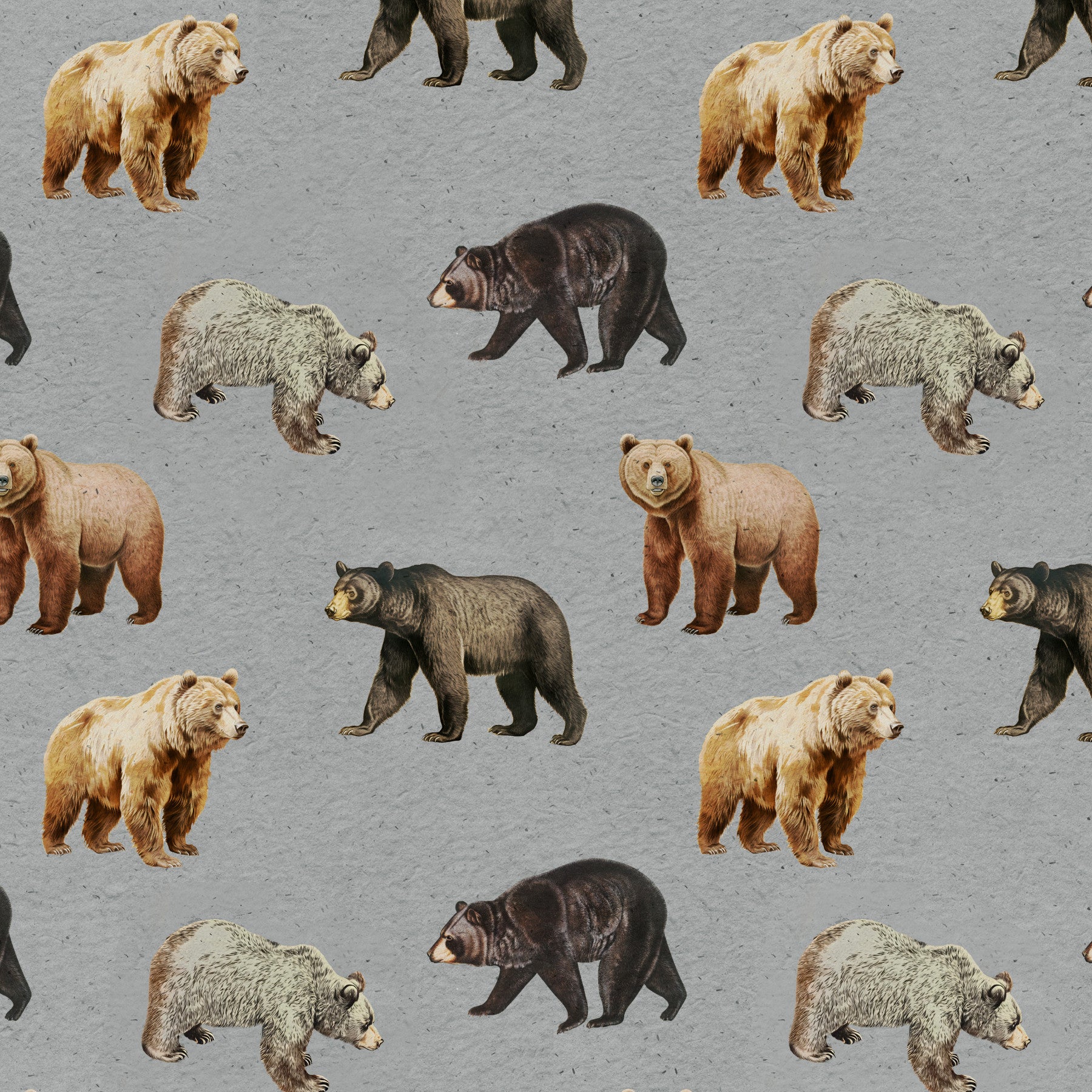 Immerse yourself in the serene beauty of the 'Forest Bears' wallpaper. This captivating design features a charming collection of brown bears and black bears, rendered in a vintage illustration style against a subtle gray textured backdrop. The bears, depicted in various poses and shades, evoke a sense of quiet wilderness. This wallpaper is perfect for adding a touch of rustic charm and nature's majesty to any digital device, creating a peaceful and captivating atmosphere. The repeating pattern makes for a seamless and aesthetically pleasing visual experience.