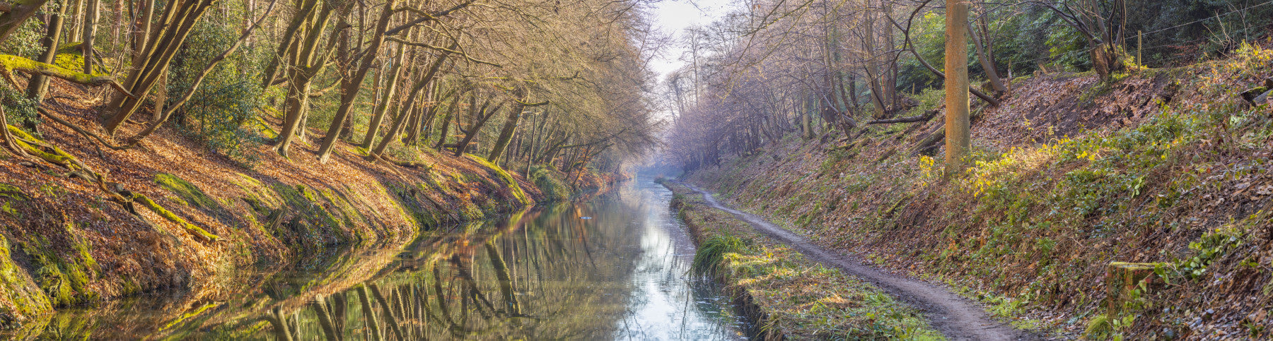 Escape to tranquility with this captivating wallpaper. The image depicts a serene canal winding through a forest, its still waters mirroring the surrounding trees. Autumnal hues of brown and gold paint the banks and the forest floor, creating a warm and inviting atmosphere. The path beside the canal whispers of peaceful strolls and quiet contemplation. This wallpaper is perfect for anyone seeking to bring a touch of nature's calm and beauty into their home, offering a relaxing and meditative ambiance. The high-resolution image ensures exceptional detail and visual richness.