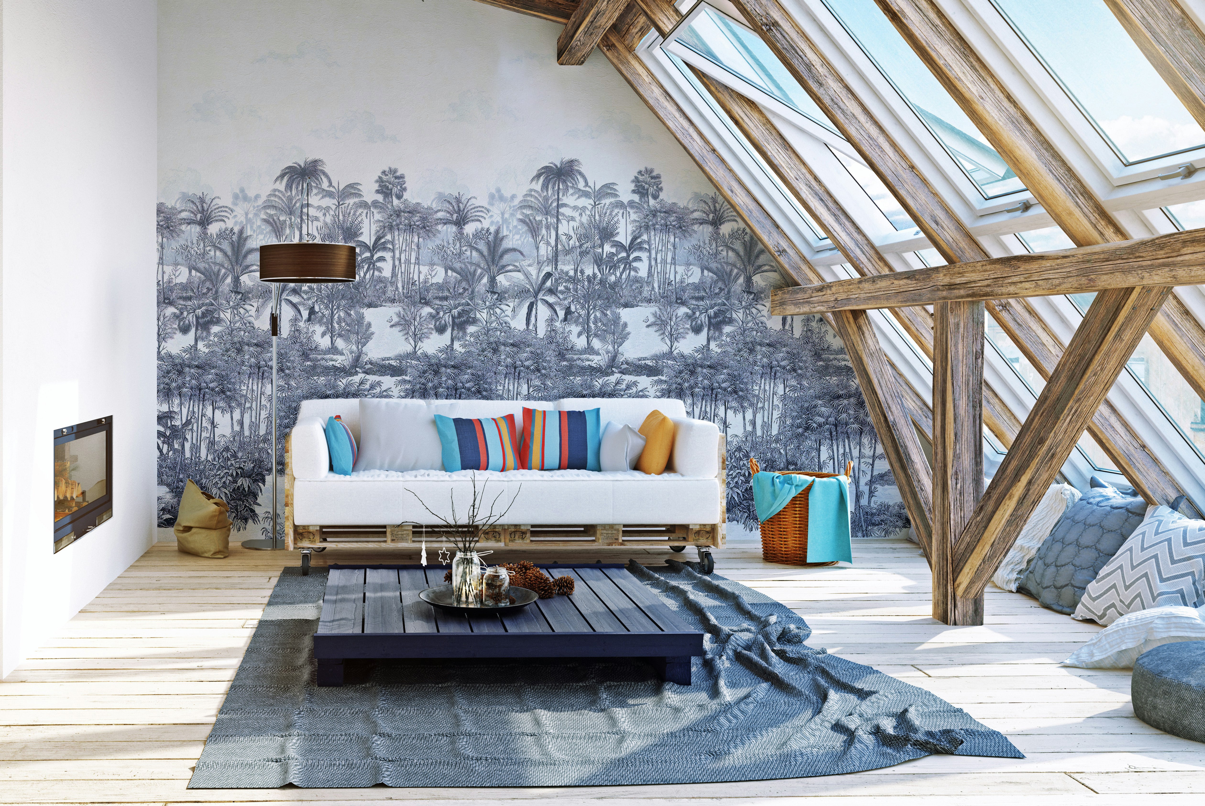 The vibrant and enchanting beauty of the tropical rainforest has a way of captivating the senses. And if you're looking to bring some of that wonder into your living room, look no further than a stunning tropical rainforest blue mural wallpaper. This statement piece will transport you to a lush paradise filled with towering trees and exotic wildlife. The black and white wallpaper accents that you pair it with only enhance the mural's striking hues. Incorporating this timeless and captivating design into your home will transform your space into an oasis of visual delight.