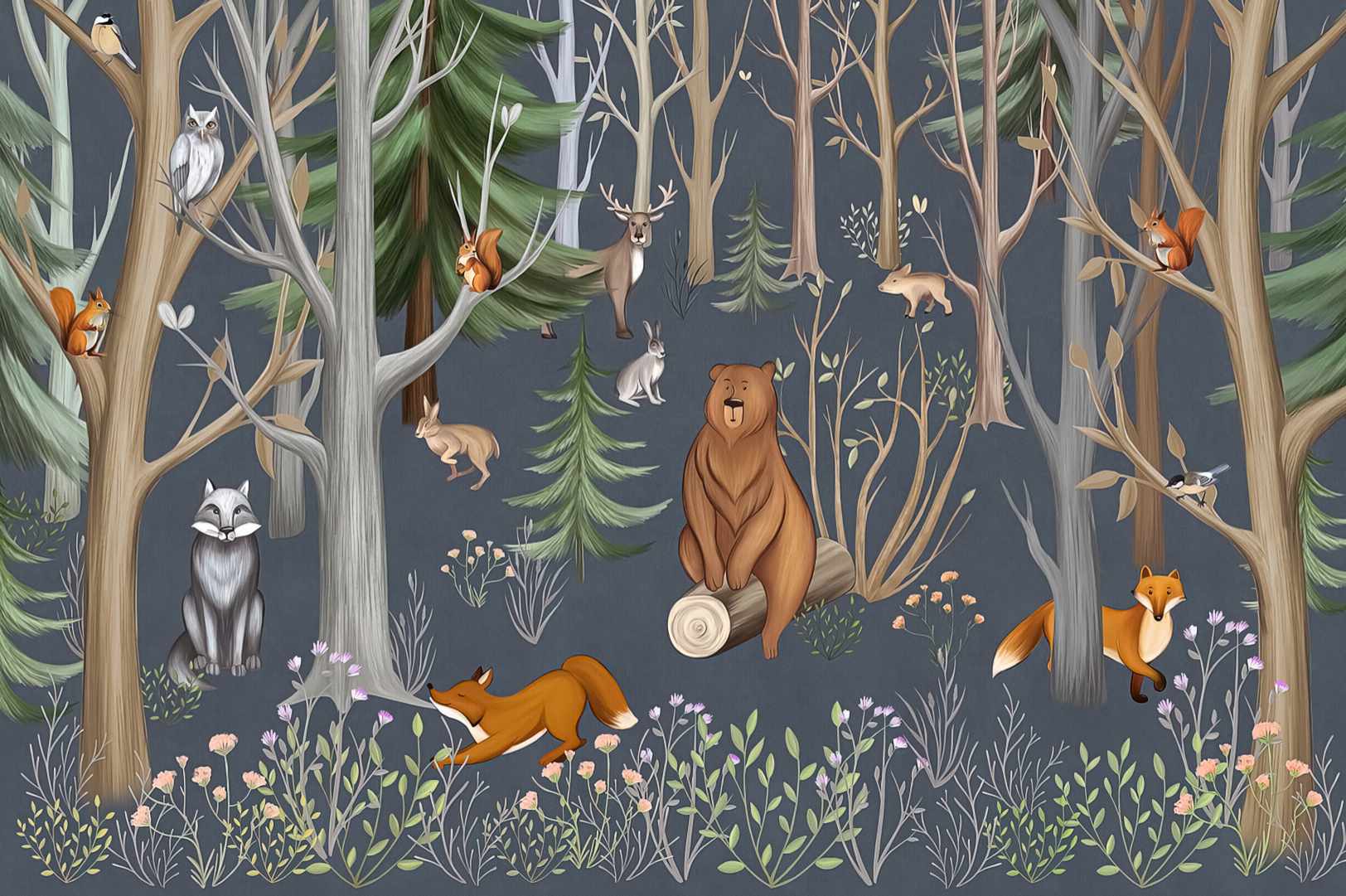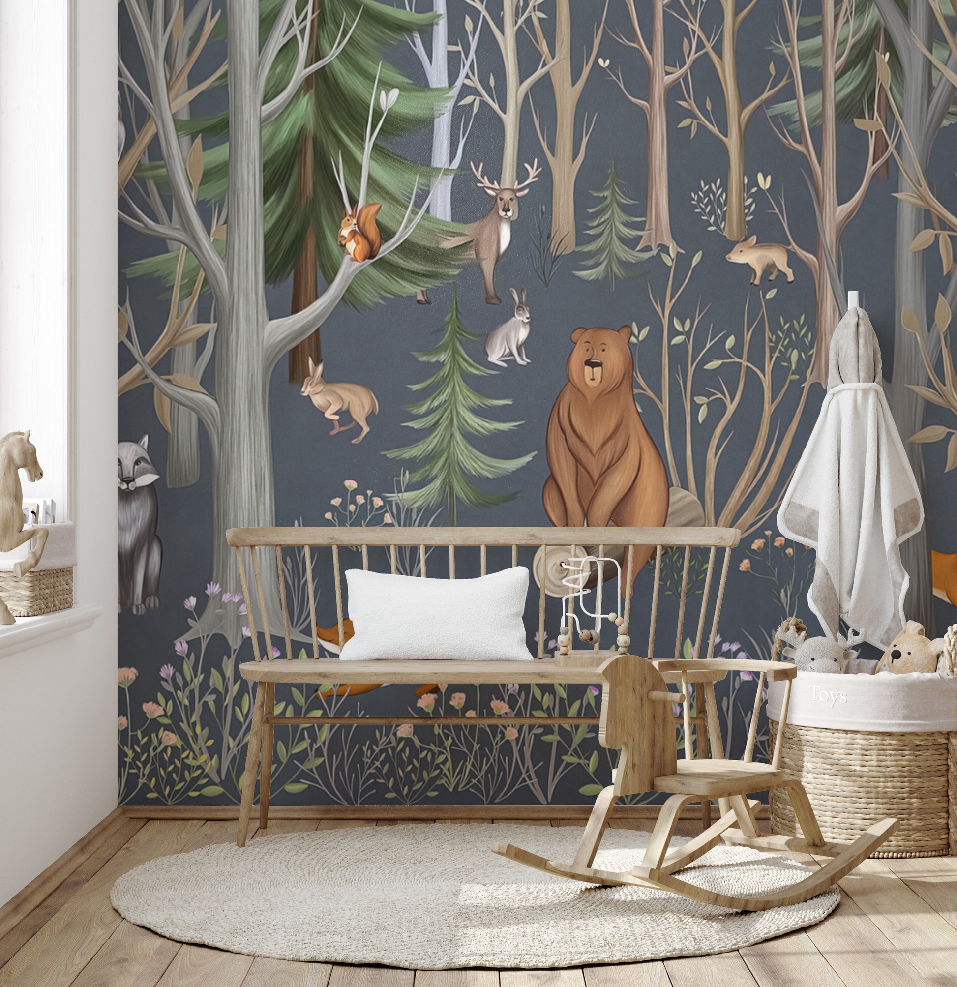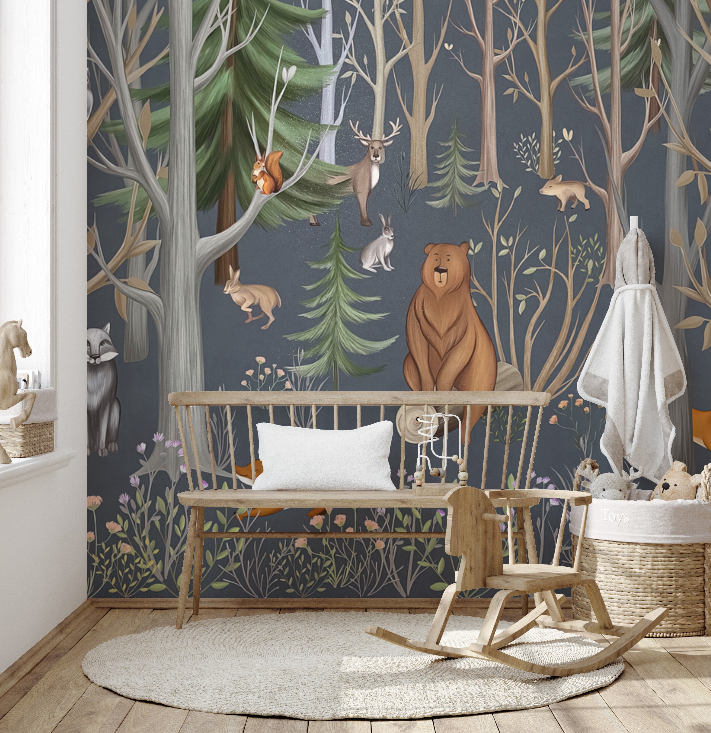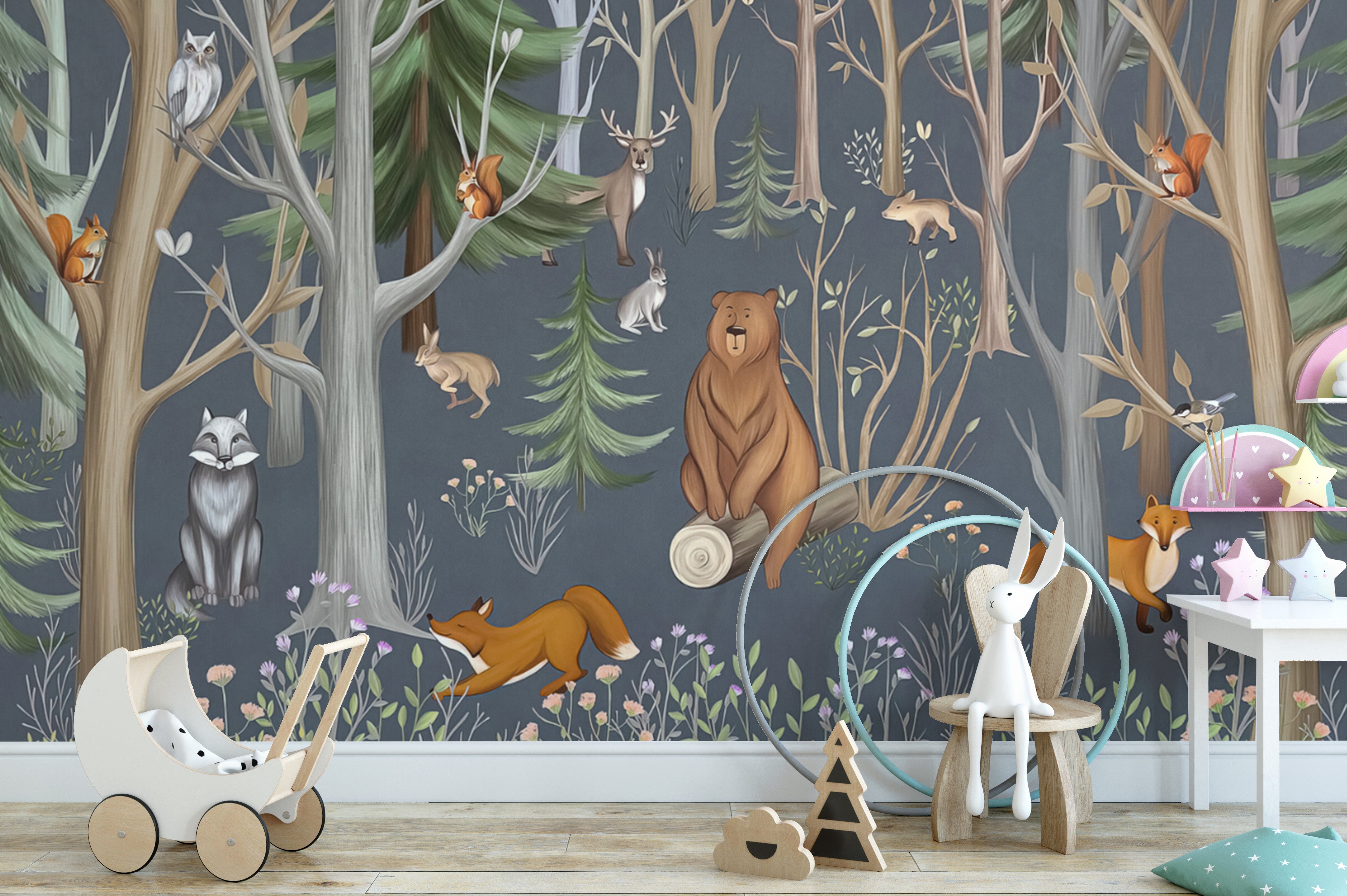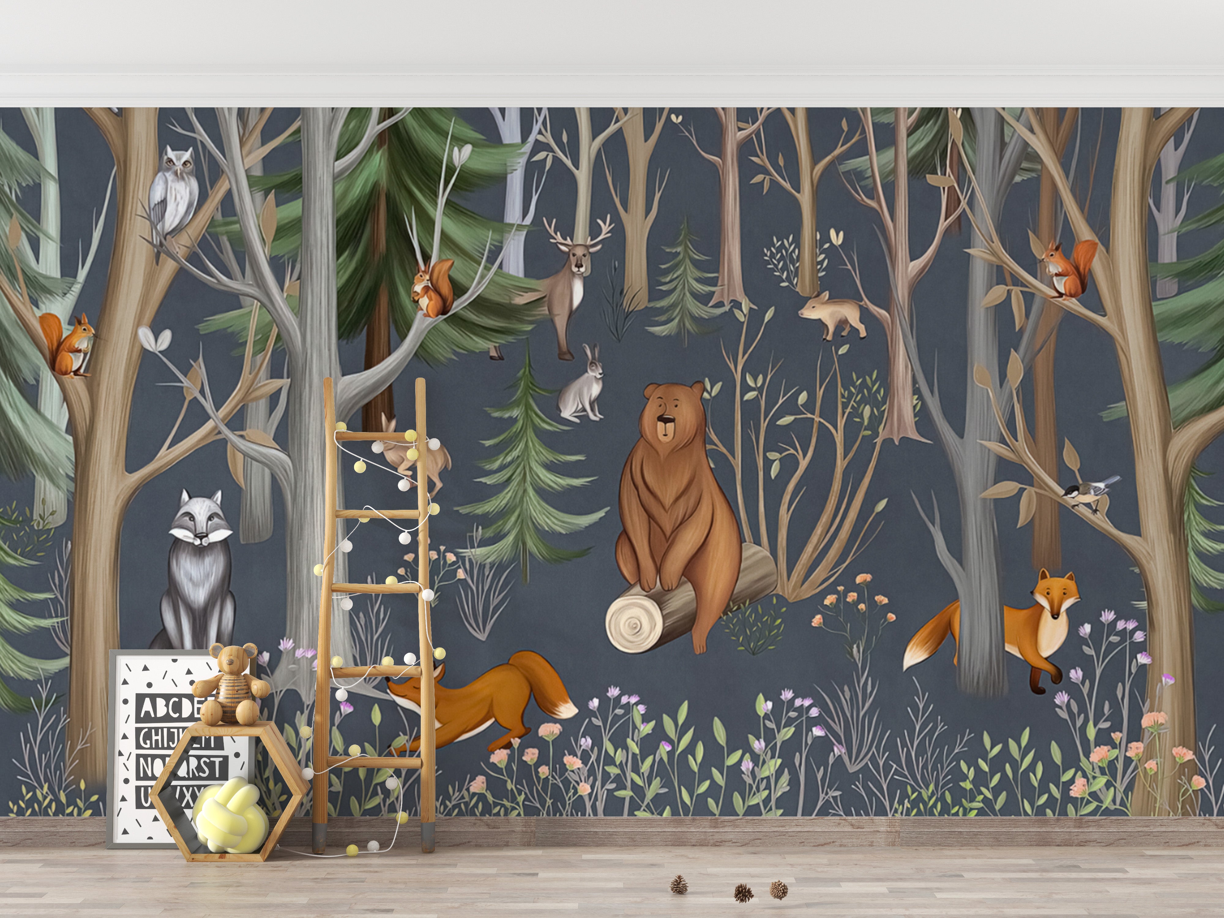 Step into a whimsical woodland with our forest quartet mural wallpaper. Perfect for transforming any child's space into a magical haven, this cartoon nursery wallpaper showcases a delightful ensemble of cartoon animals harmoniously playing together amidst the verdant forest backdrop. Each character has been intricately designed to capture the imagination of little ones, making it not just a wallpaper but a story waiting to unfold. This captivating cartoon animal wallpaper offers both style and charm, ensuring your nursery stands out with a touch of enchantment.