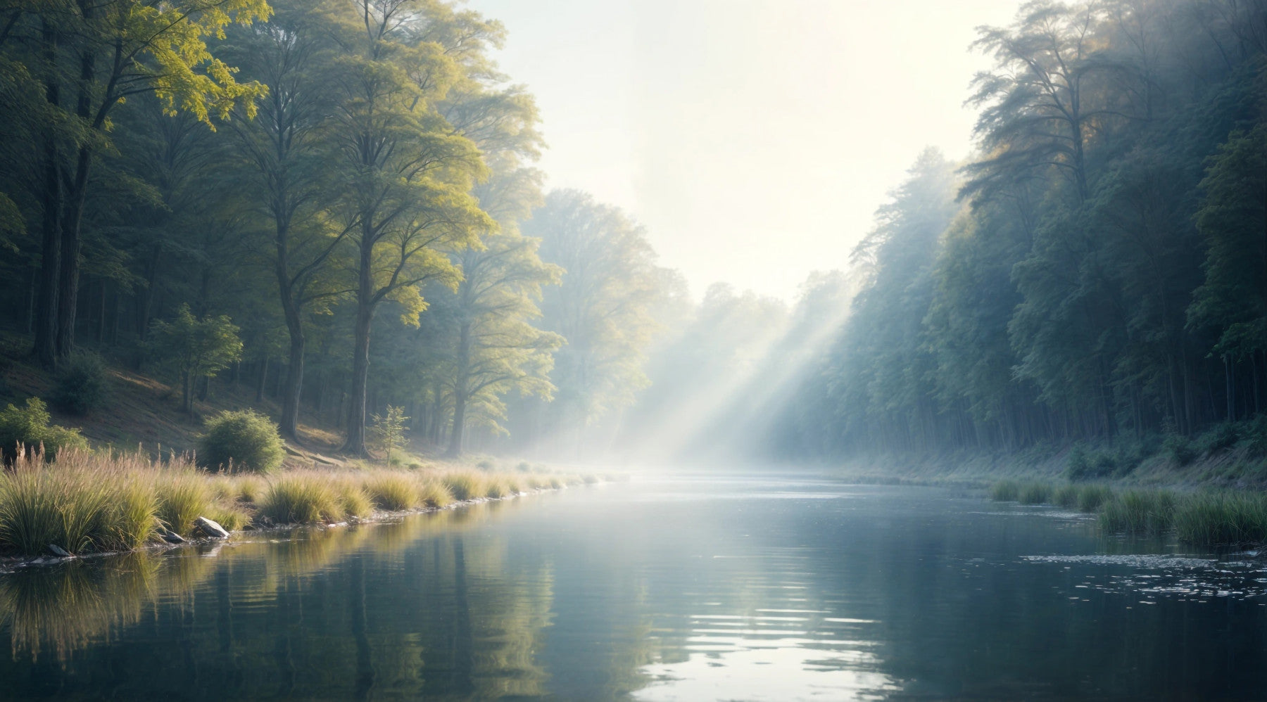 Escape to a world of tranquility with this captivating wallpaper. A misty river flows serenely through a dense forest, bathed in the ethereal glow of the rising sun. Sunlight streams through the trees, casting a magical light upon the still water. The image evokes a sense of wonder and mystery, a peaceful retreat from the everyday. The soft, muted colors and the stillness of the scene create a calming and meditative atmosphere, perfect for bedrooms, living rooms, or any space where you desire a sense of peace and escape.