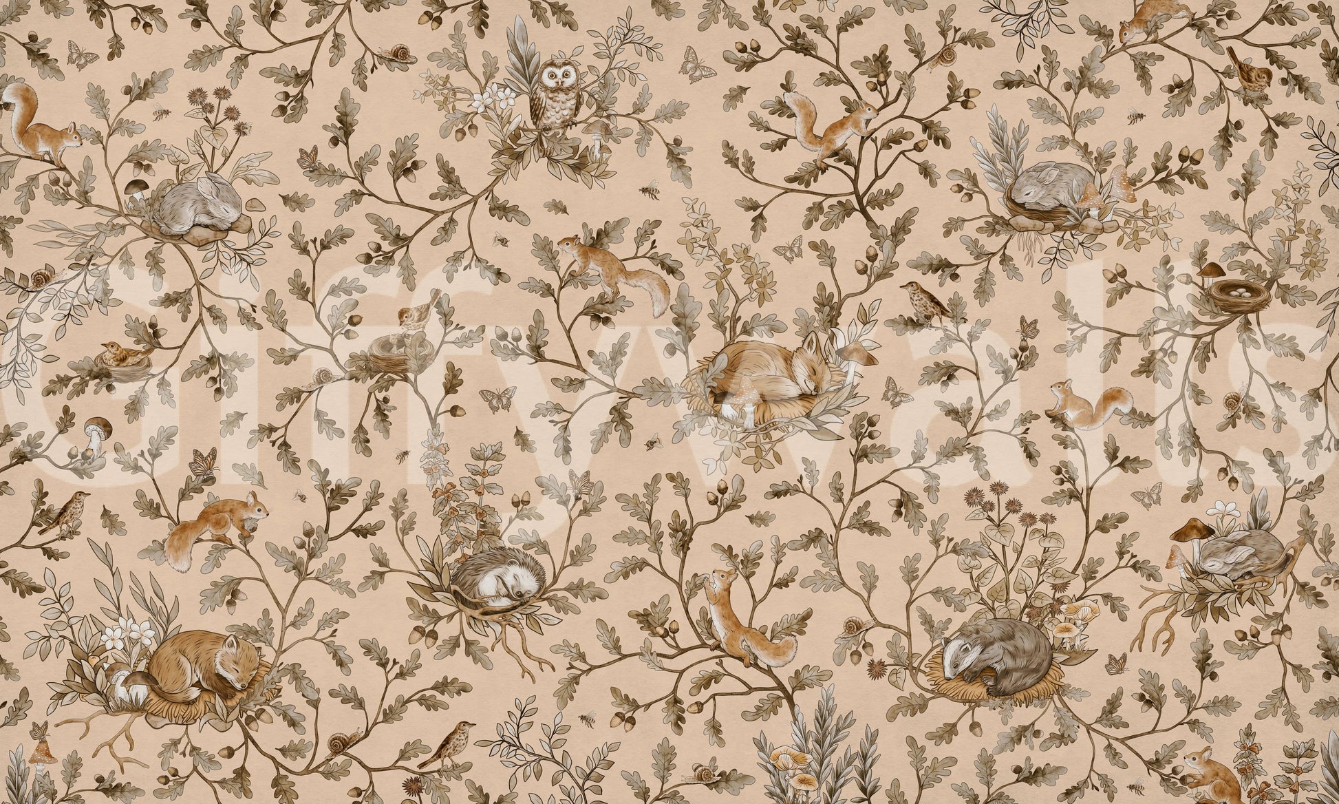 Transform your room with this enchanting forest-inspired wallpaper for walls. Featuring a delicate design of woodland creatures napping peacefully amidst oak branches and foliage, the wallpaper brings a sense of serenity to any space. The artwork utilises a palette of muted beige and brown tones, creating a cosy and calming atmosphere. It is ideal for bedrooms, nurseries, or living rooms, offering a touch of natural beauty that complements rustic, traditional, or even Scandinavian interiors.