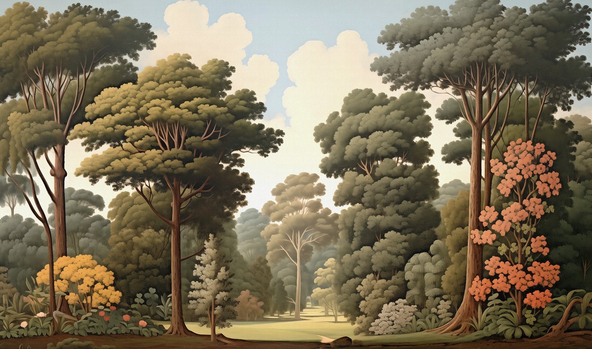 Forest woodcut green wallpaper murals for a fresh and earthy home decor.