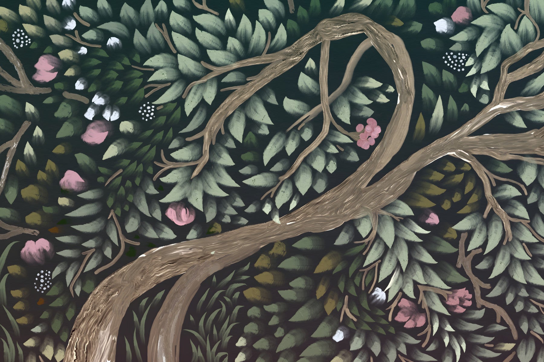 Tree canopy wall mural behind bed, modern bedroom styling, deep green colours