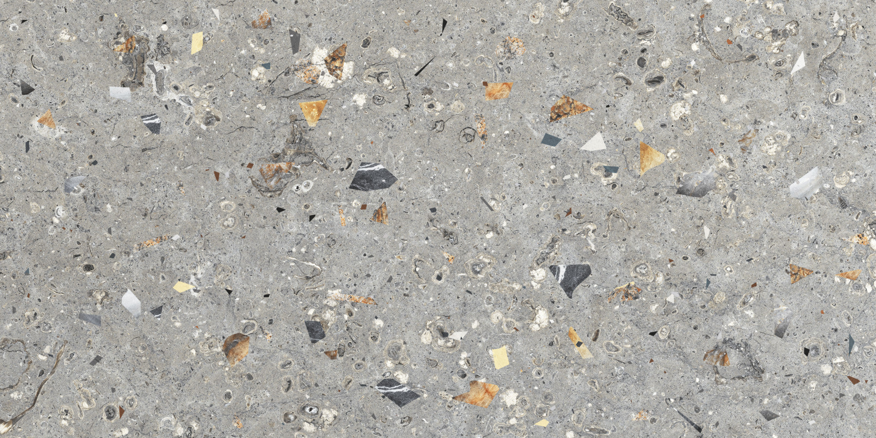 Rugged grey terrazzo wallpaper with fossilized elements.