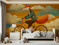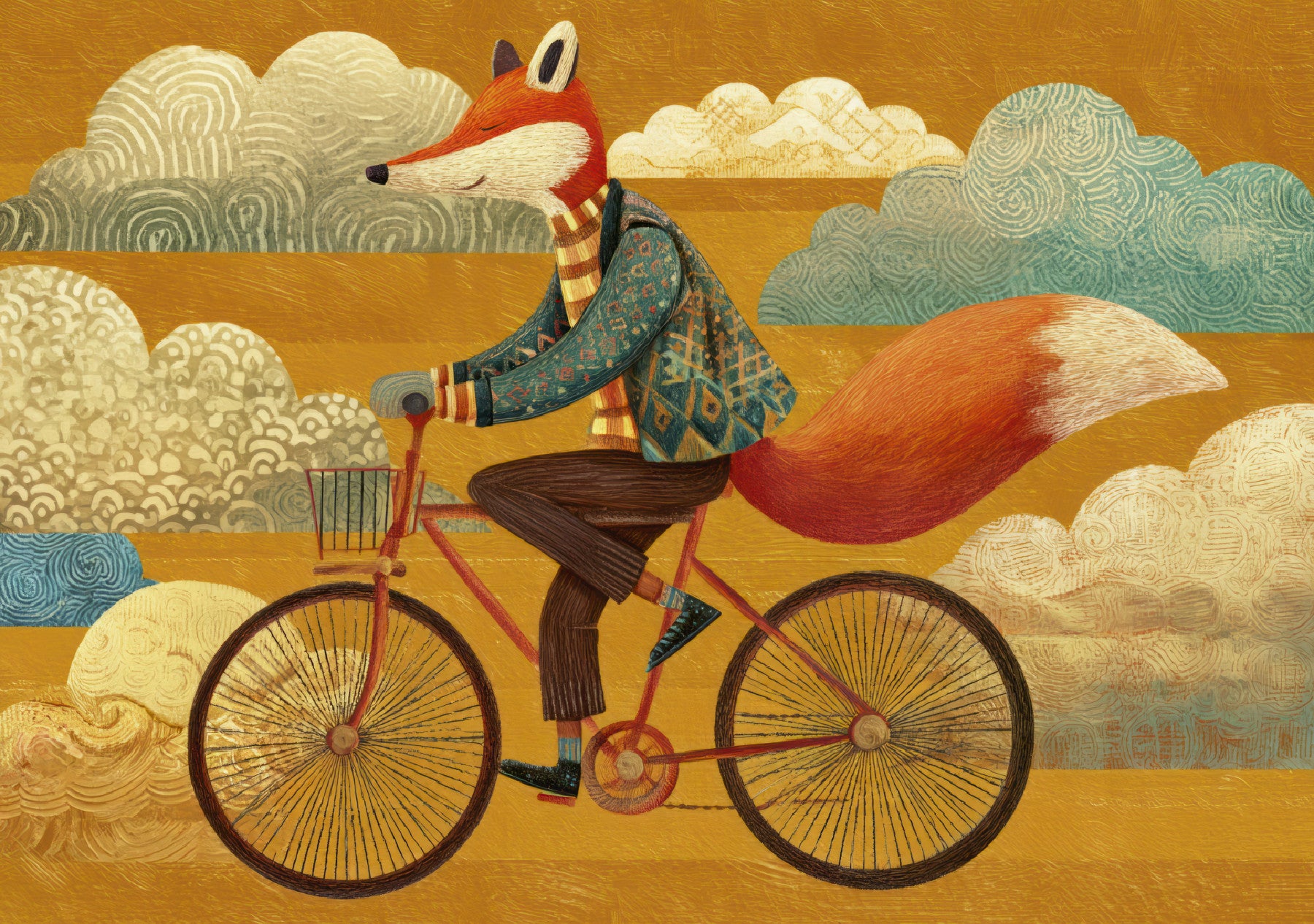 A whimsical illustration of a fox dressed in autumnal attire, riding a vintage bicycle across a textured, golden landscape. The clouds above are stylized and textured, adding depth and visual interest. Warm, earthy tones dominate the palette, creating a cosy and nostalgic mood, perfect for a living room or bedroom. The hand-drawn style and charming character add a touch of playful sophistication, making it a delightful piece for any space that needs a unique and cheerful touch. The image blends elements of folk art and illustration, adding an authentic and original feel.