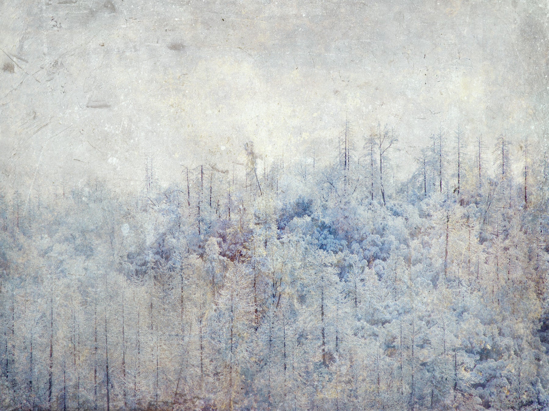 Drift into a serene winter landscape with this captivating wallpaper for walls. Bare trees covered in frost create a hazy, ethereal scene. The soft blues and whites instill a sense of peace. This design offers a tranquil backdrop for bedrooms, hallways, or any space that needs a touch of nature's calm. Imagine this design in a room with natural light. It complements minimalist or rustic interiors, offering a peaceful retreat in your home.