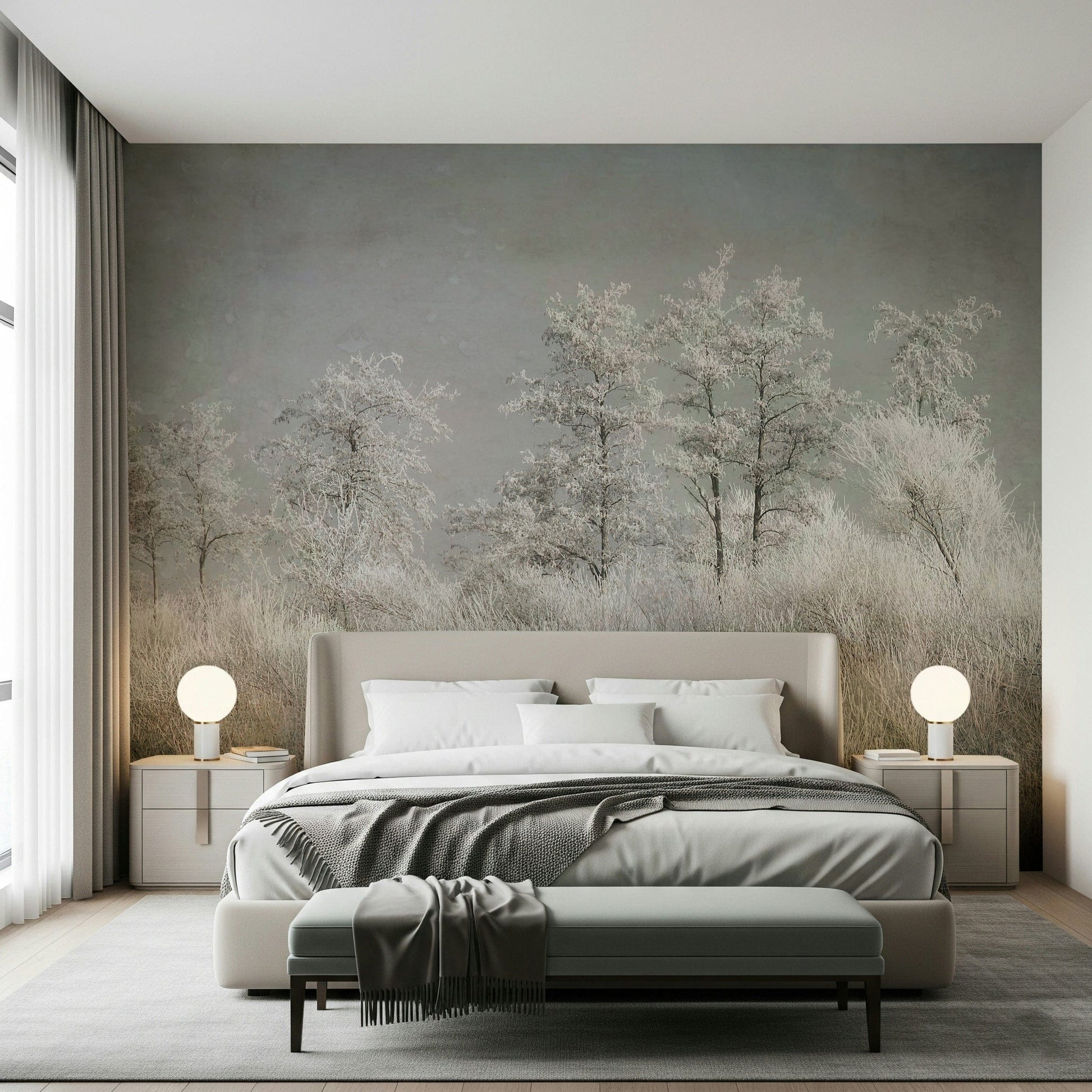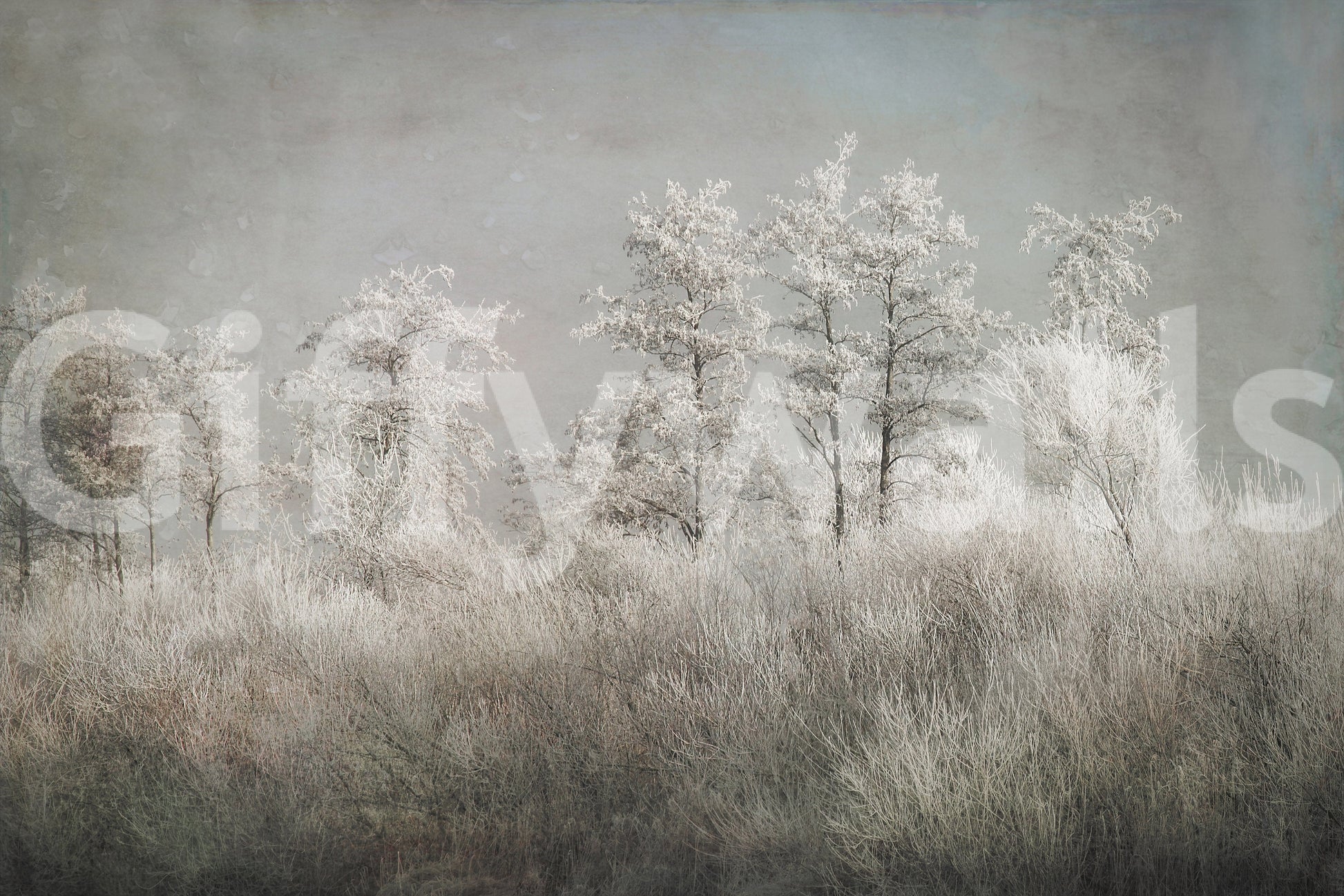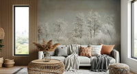 Transform your space with this serene wallpaper for walls. The design showcases a frosted landscape, where ice-covered trees and grasses create a peaceful scene. The cool, muted tones of grey, white, and beige bring a calming effect to any room. This wallpaper works wonderfully in bedrooms, living rooms, or even hallways, offering a touch of nature's quiet beauty. Let this tranquil design bring a touch of winter's stillness to your interiors.