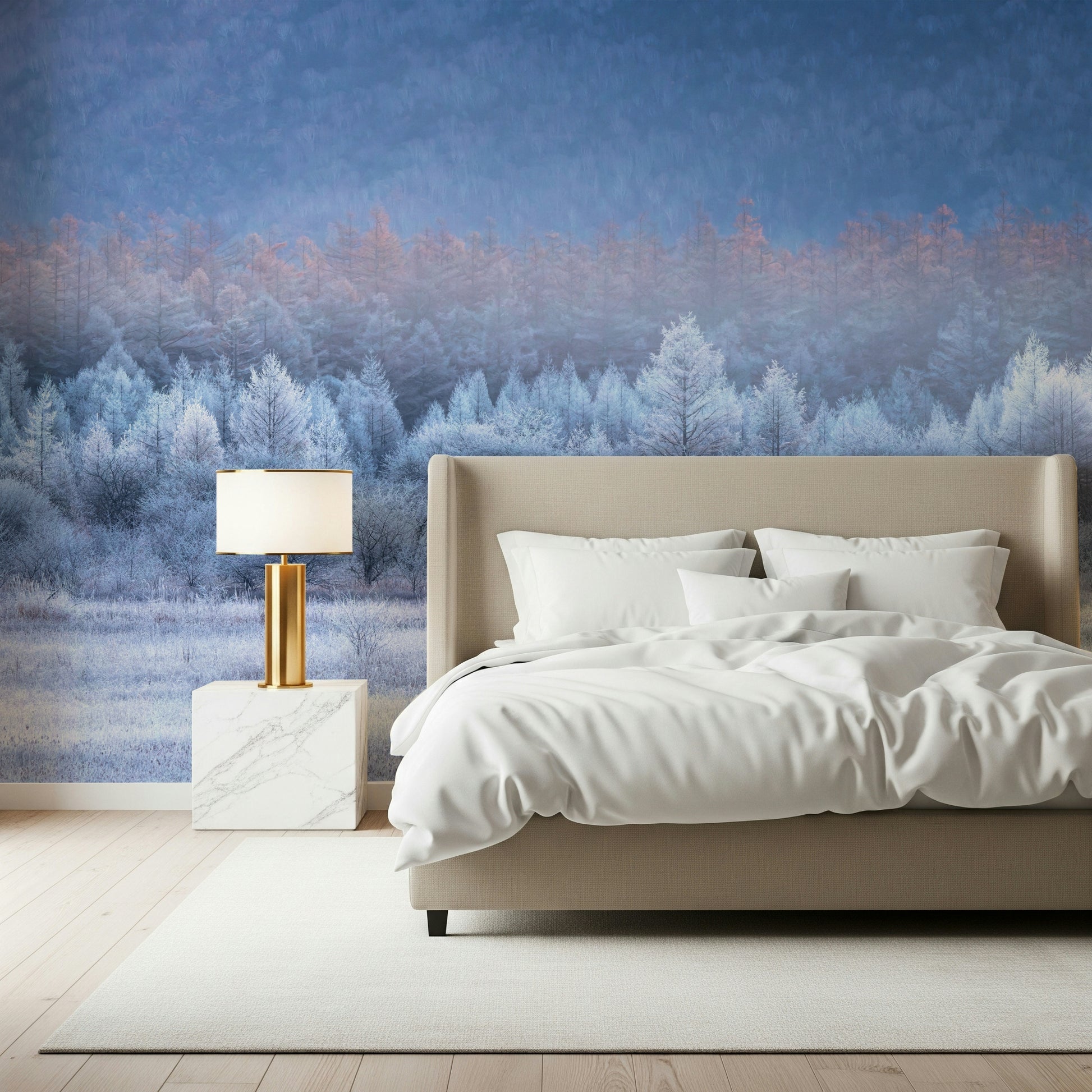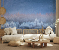 Bring the beauty of winter inside with this stunning vista. The design features a frosted forest bathed in the soft glow of dawn. A blend of blues, whites and subtle peach hues create a calming visual. Use this wallpaper for walls to transform a bedroom or living room into a tranquil retreat. It also works well in an office, creating a peaceful and inspired work environment. The peaceful image complements many styles.