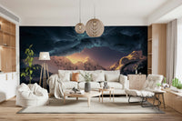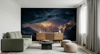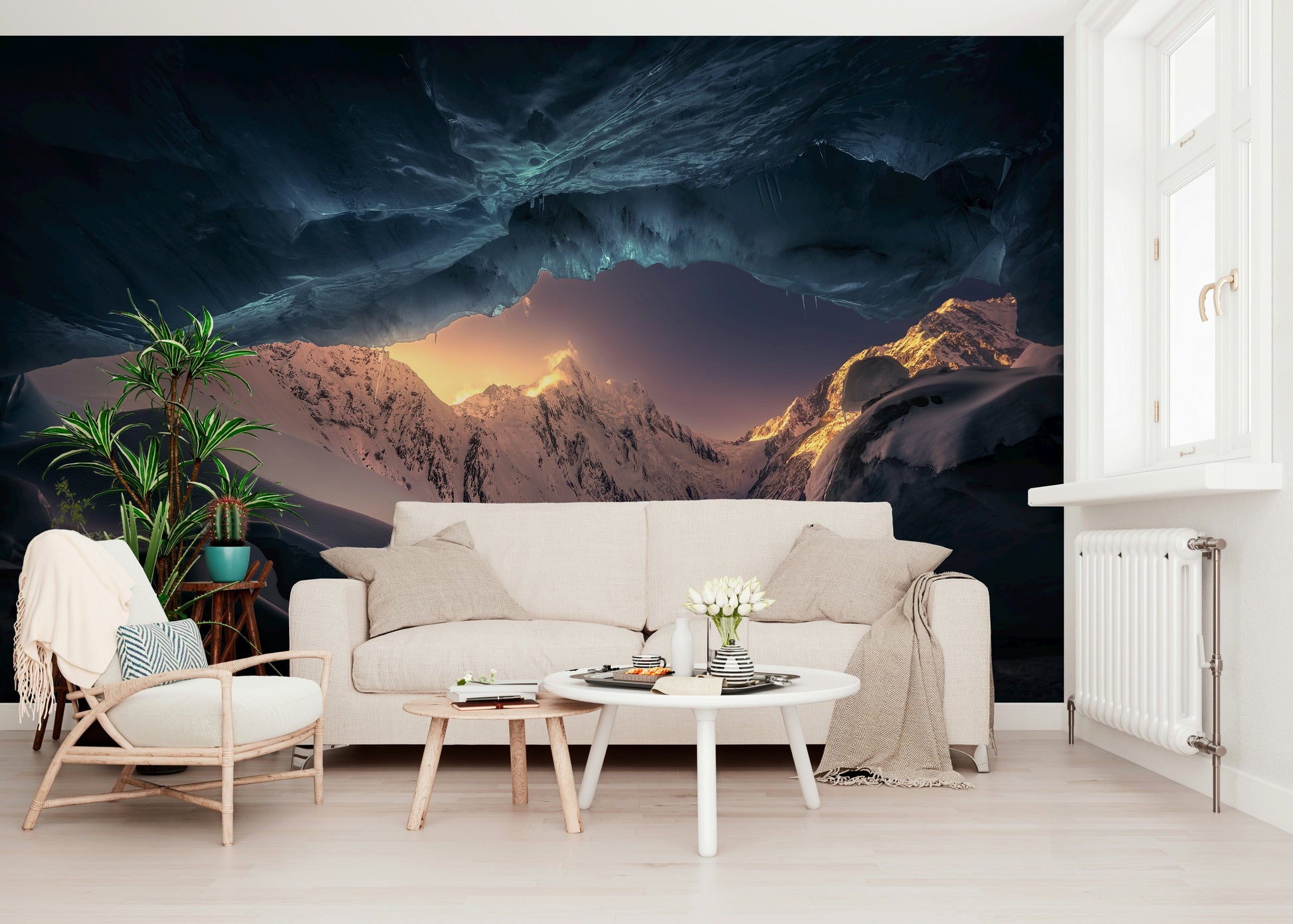 Transform your space with this landscape wallpaper for walls. It pictures a view from inside an ice cave that opens up to a snow-covered mountain range lit by a radiant sunrise. The cool blue tones of the ice and snow create a calming environment, while the warm light provides a beautiful contrast. Ideal for a living room, bedroom, or office, this wallpaper brings a touch of serene beauty and natural wonder to any interior.