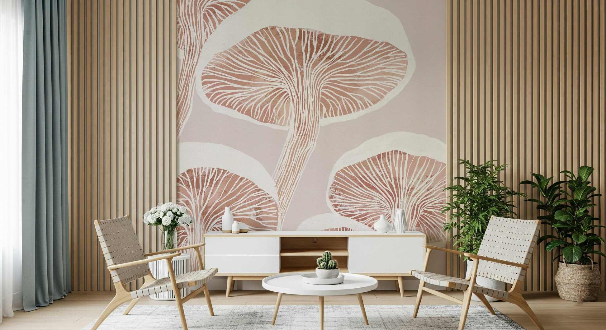 Immerse yourself in the subtle beauty of the woodland with "Fungi Forest Charm". This enchanting design captures the delicate allure of fungi in a stylised, artistic rendering. The composition features ethereal mushrooms in a soft, earthy palette of muted rose and creams, creating a calming and sophisticated ambiance. Intricate white line work emphasises the organic structures of the fungi, adding depth and visual interest to the piece.