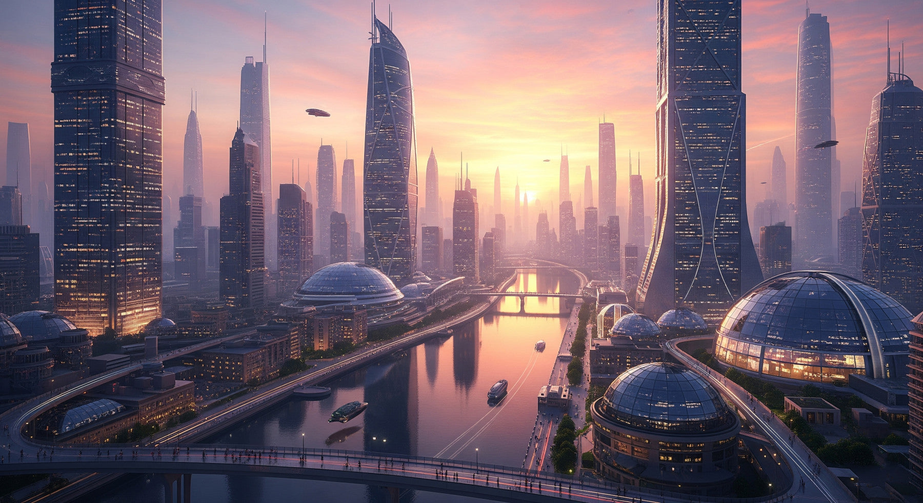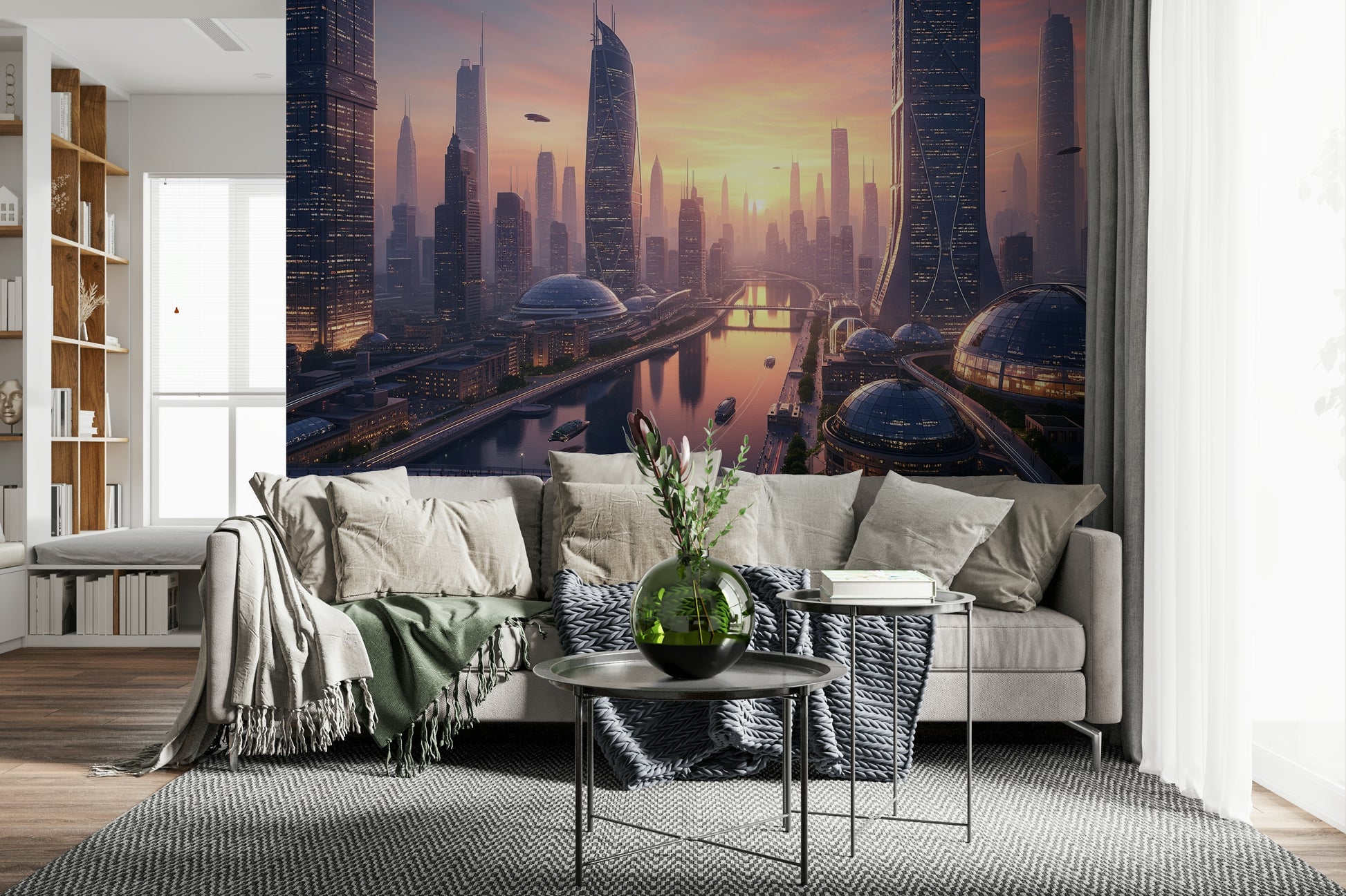 Bring a touch of tomorrow into your home with this evocative wallpaper for walls. A sprawling futuristic metropolis rises majestically against a serene sky, bathed in a gentle, warm glow. The high-rise buildings blend seamlessly with artistic domed structures, creating a unique visual harmony. Ideal for living rooms, home offices, or even dining rooms, this design transforms any space into an immersive environment, sparking conversation and igniting imagination. The wallpaper's neutral and warm tones allow it to easily complement a variety of interior design styles, bringing a modern and sophisticated flair to your décor.