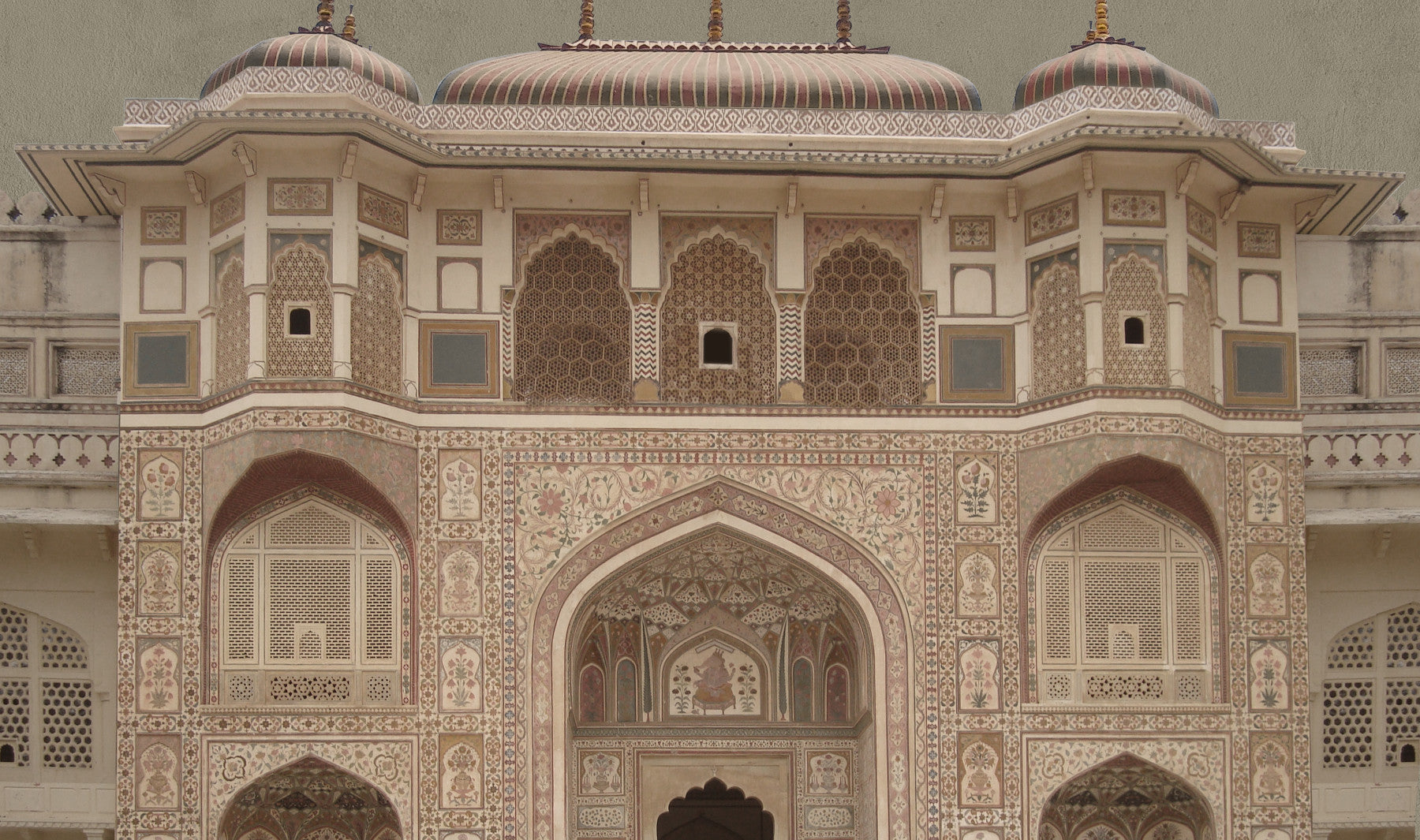 The design features a repeating pattern inspired by the Ganesh Pol gate.