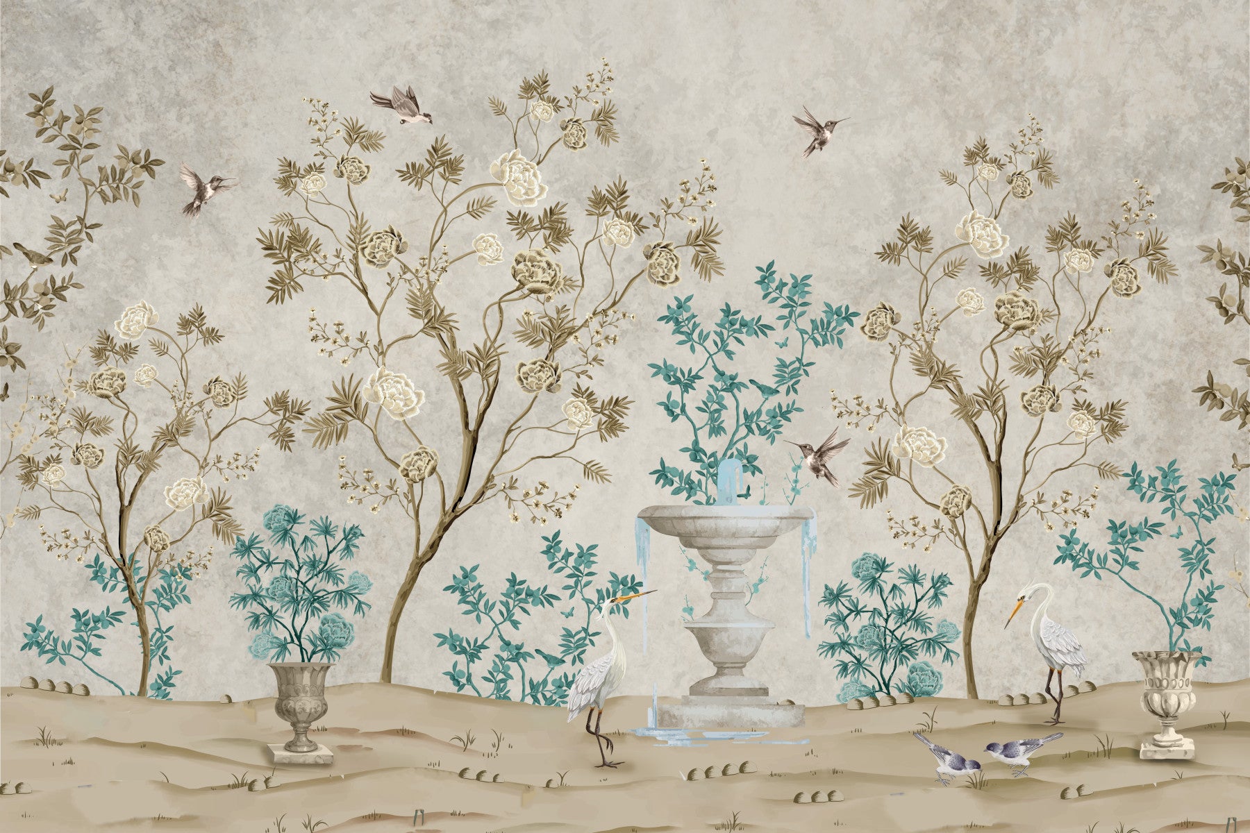 Immerse yourself in a soothing garden fable with this stunning wallpaper. See birds flutter around trees, water flows from a fountain, all set against a gentle beige backdrop. This graceful composition will revitalize your living room, bedroom, or entryway. This wallpaper for walls effortlessly brings natural beauty and artistic flair to your rooms. It's great for classic and modern designs, creating a space where quiet elegance meets the beauty of nature.