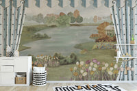 This garden landscape mural adds peacefulness to your walls. A charming lake, lush flowers, and a lovely little gazebo provide an element of charm and beauty to the whole room. These soft pastel shades complement the rich natural beauty in the garden by adding the elegant design of framing curtains. This mural is perfect for creating a relaxing atmosphere in your living space or bedroom. Shop now and enjoy free shipping on your order!