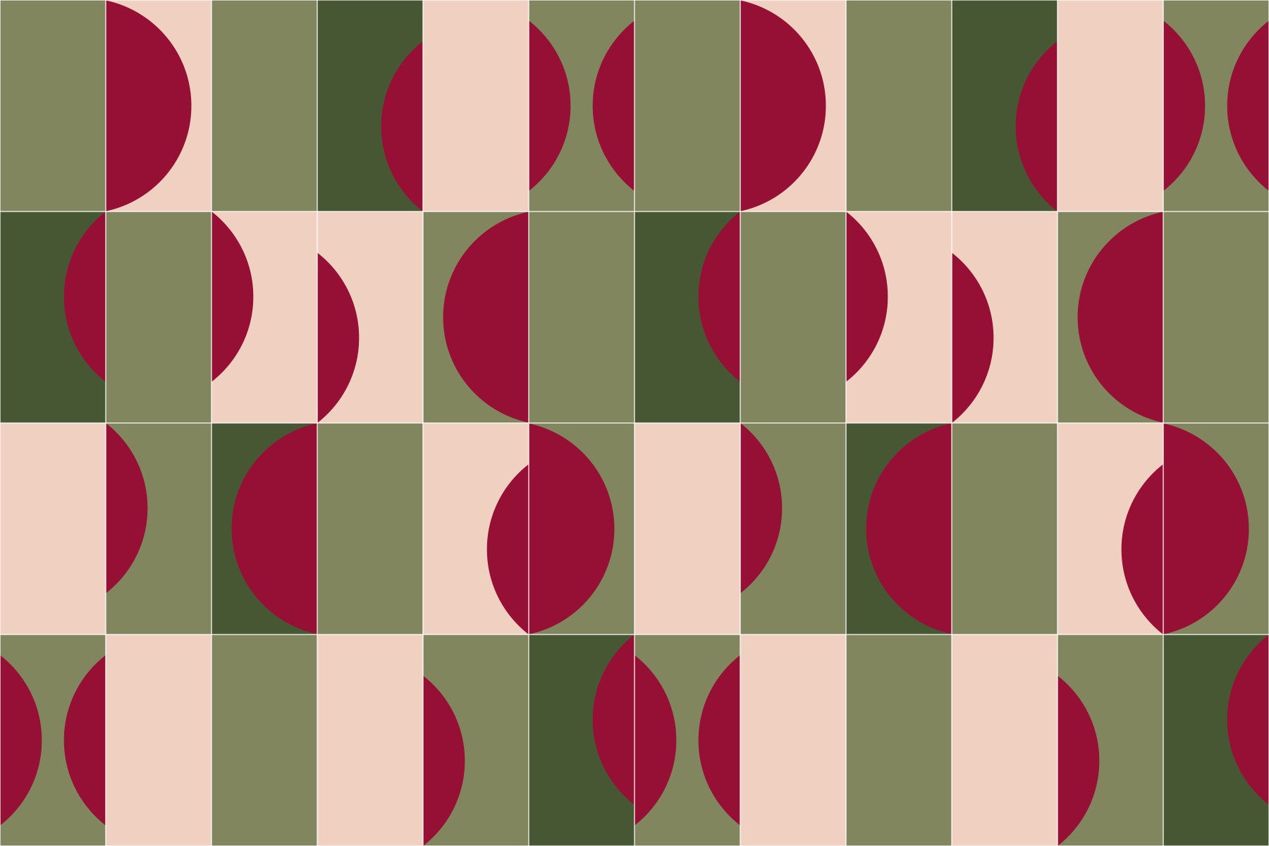 Evoke the understated elegance of a modern garden with Garden Tiles 03. This captivating wallpaper features a geometric pattern reminiscent of artfully arranged garden pavers. Semicircles of deep burgundy intermingle with soothing shades of muted green and gentle blush, creating a balanced and visually intriguing composition. The clean lines and crisp tile arrangement offer a contemporary twist on natural forms, bringing a touch of refined outdoor serenity into any space. Ideal for those seeking a calming yet stylish backdrop, 'Garden Tiles 03' provides a unique and sophisticated statement, whispering of tranquil gardens and sun-drenched afternoons. Transform your walls into a minimalist haven with this effortlessly chic design, bringing the harmony of nature indoors.