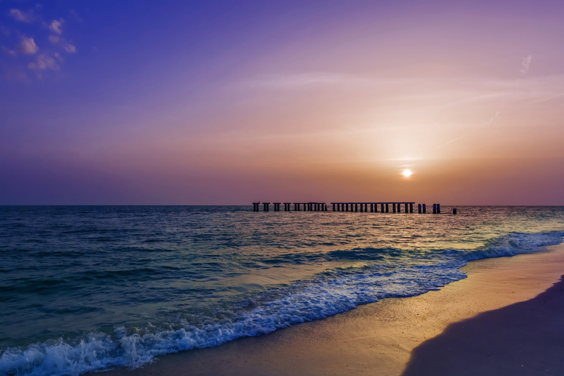 Experience the breathtaking beauty of a Gasparilla Island sunset with this captivating wallpaper. The image showcases a tranquil Florida beach scene where gentle waves caress the golden sand, illuminated by the warm hues of the setting sun. A serene, purple-tinged sky creates a stunning contrast to the ocean's deep blues and greens. The silhouette of a weathered pier, stretching into the calm sea, adds a touch of mystery and quiet charm. This wallpaper perfectly captures the peaceful atmosphere and vibrant colors of a Gasparilla Island sunset, offering a serene escape for your space.