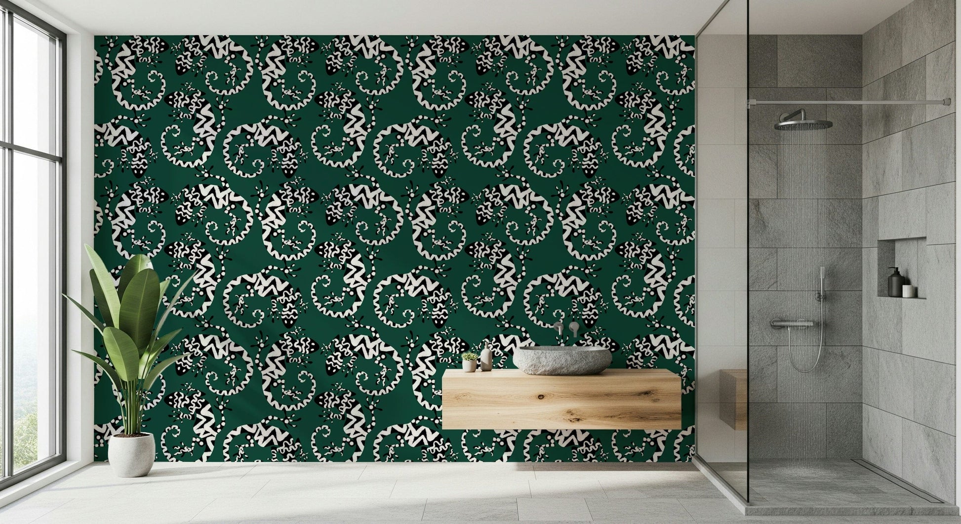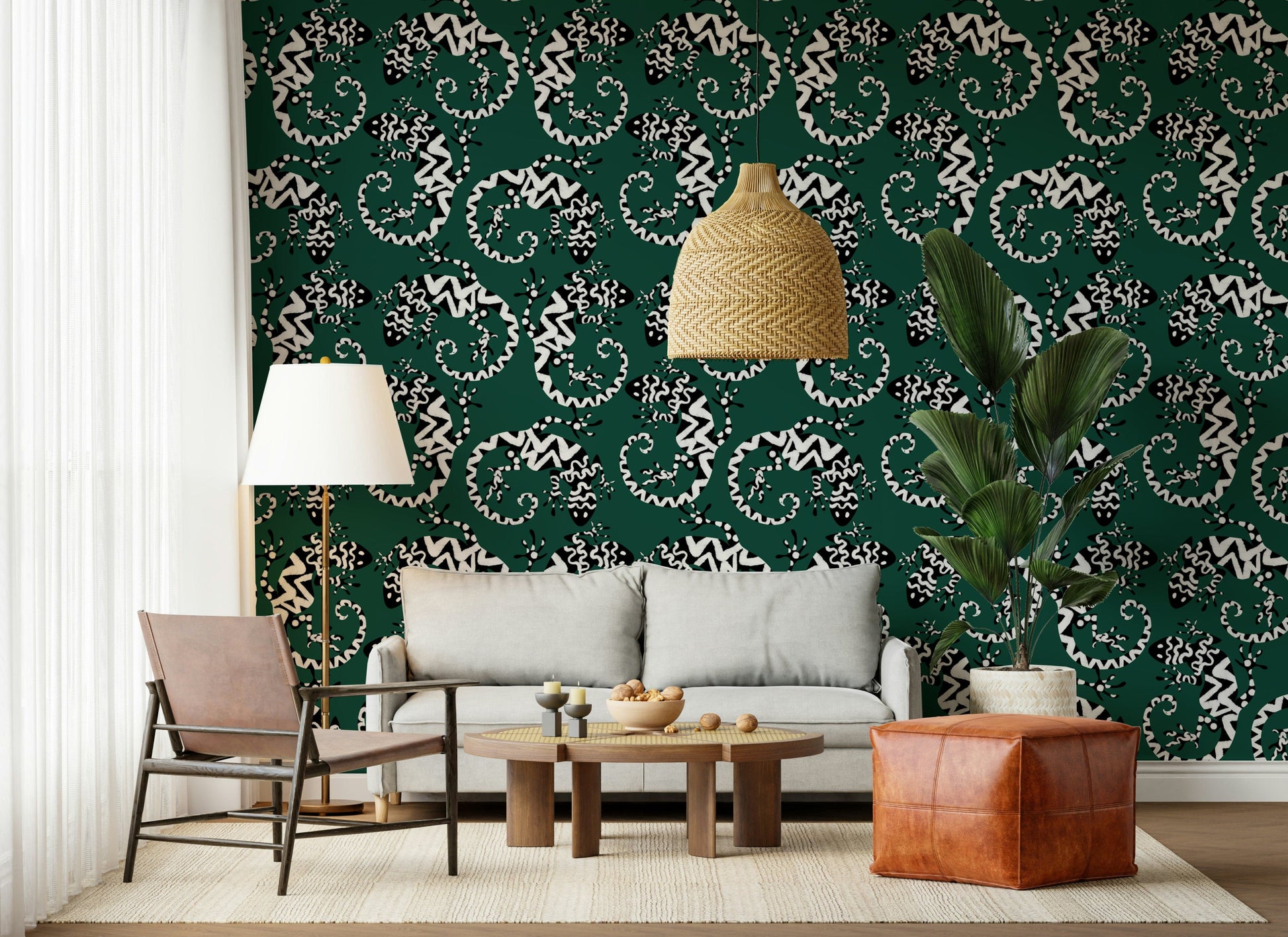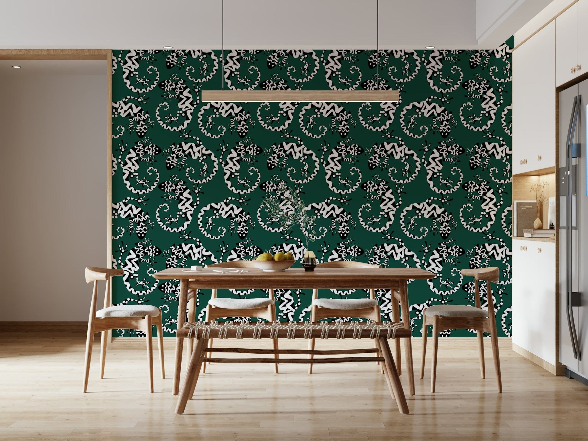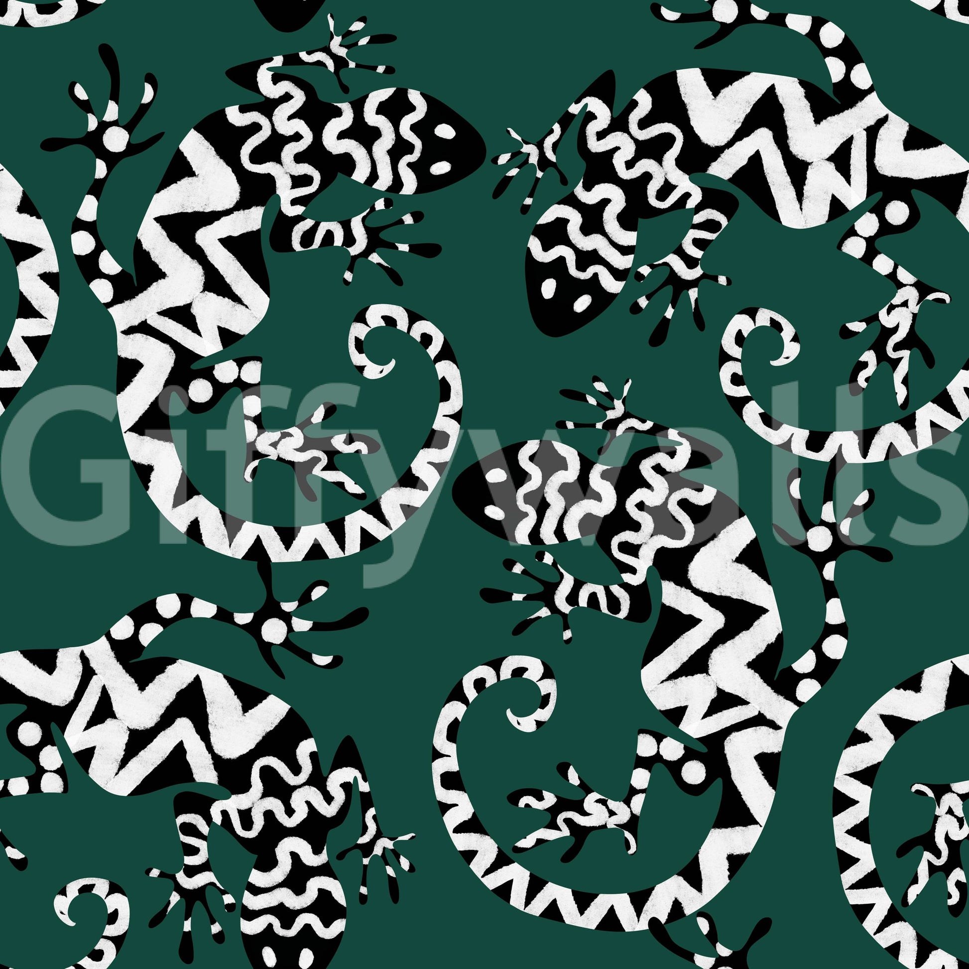 Transform any room with this striking gecko-inspired wallpaper for walls. The graphic black and white pattern against a deep green background brings a touch of exotic flair. The stylized lizards create a lively, repeating motif that is both modern and timeless. Ideal for adding personality to living rooms, hallways, or even bathrooms, this design works particularly well in spaces seeking a touch of whimsy. It adds visual interest without overwhelming the space, complementing both minimalist and maximalist interior styles. The pattern's bold contrast enhances the sense of depth, making smaller rooms feel more expansive.
