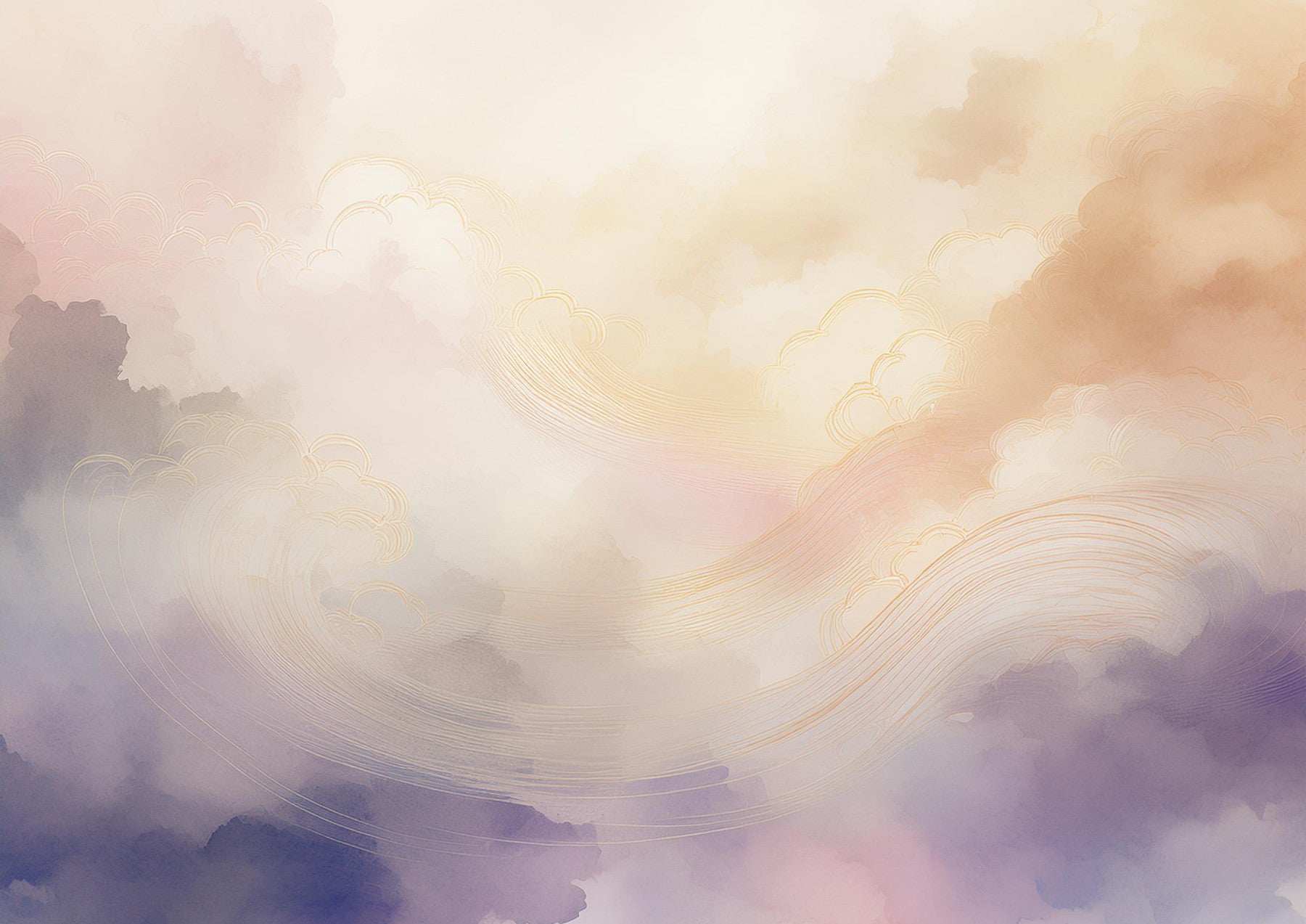 Experience the gentle caress of a soft breeze with this captivating wallpaper. Delicate watercolor washes in calming tones of blush pink, soft lavender, and creamy beige create a sense of ethereal serenity. The gold lines, gracefully tracing the form of clouds, evoke a feeling of movement and fluidity, as if the wind itself is whispering across the sky. This wallpaper's design is sophisticated yet calming, perfect for creating a tranquil and relaxing environment in bedrooms, living rooms, or even meditation spaces. Its subtle elegance and calming colours make it a versatile choice for various interior styles.