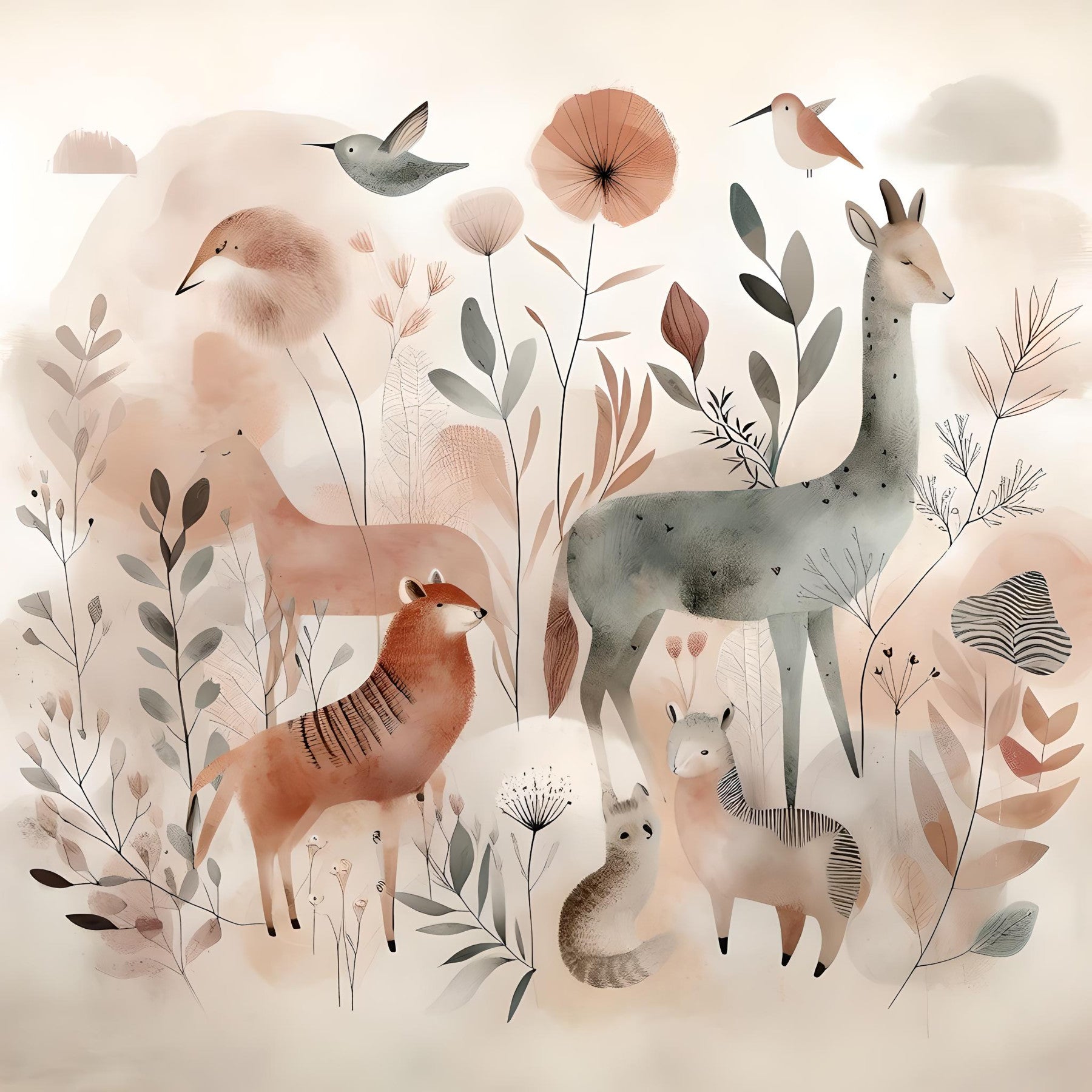 This dreamy wallpaper evokes a sense of serene tranquility with its soft, muted palette of blush pinks, terracotta oranges, and gentle greys. Delicate watercolor-like animals—a giraffe, fox, and others—blend seamlessly with stylized botanical elements. The overall effect is calming and whimsical, perfect for a nursery, child's room, or any space needing a touch of gentle elegance. The soft, almost ethereal quality of the design creates a peaceful and inviting atmosphere, making it ideal for relaxation and reflection. The subtle details and understated elegance make this a sophisticated yet playful choice for any home.