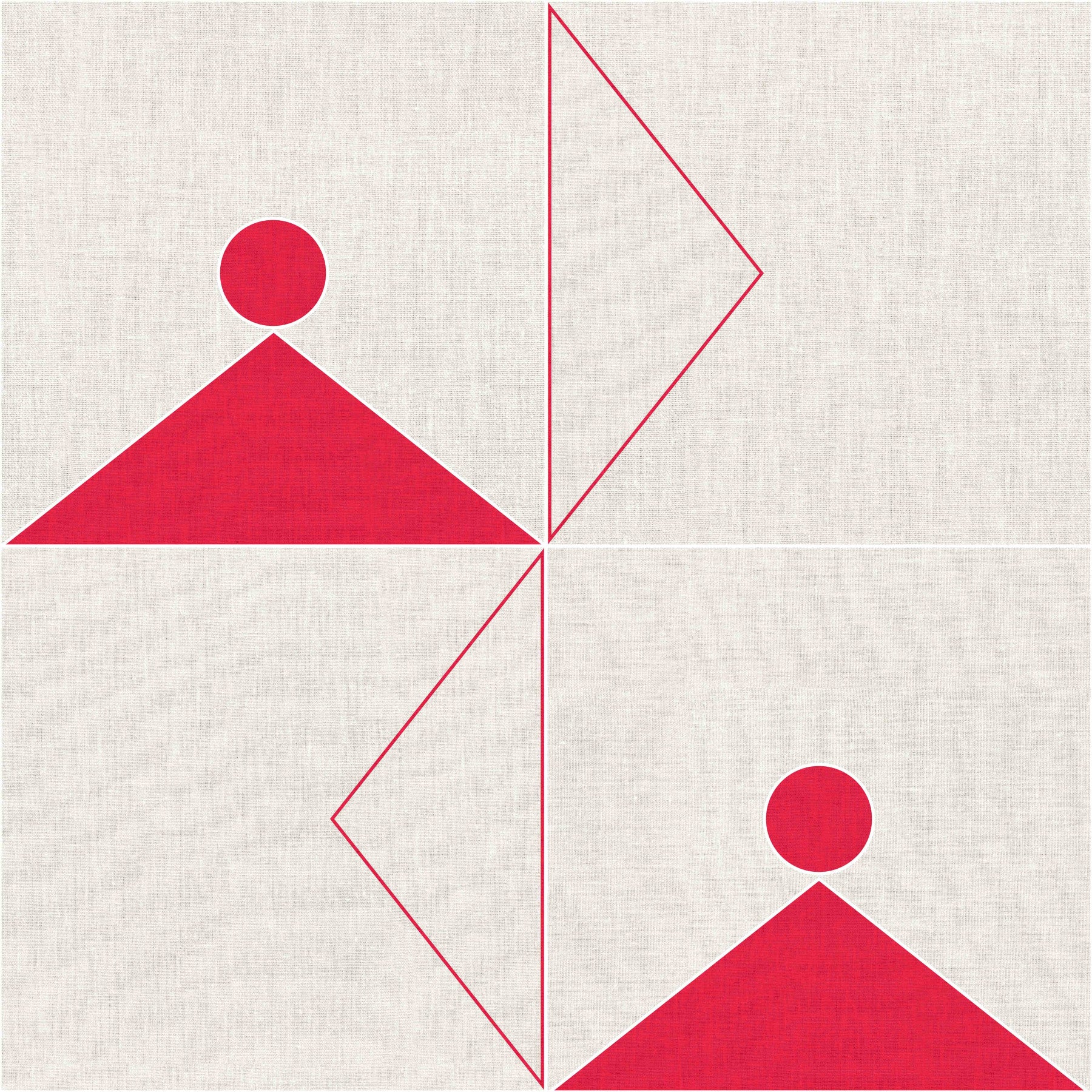 Geometric 06 presents a captivating study in contrasts and symmetry. Set against a textured, off-white canvas backdrop, bold red geometric shapes take center stage. A combination of triangles, circles, and lines creates a balanced composition across four quadrants. Two quadrants feature a solid triangle capped with a circle, while the other two showcase the skeletal outline of a triangle, forming an arrow-like design. The red pops vibrantly against the neutral background, adding a touch of modern flair to this minimalist geometric arrangement. This artwork is perfect for those seeking a clean, visually engaging, and contemporary aesthetic.