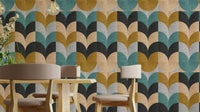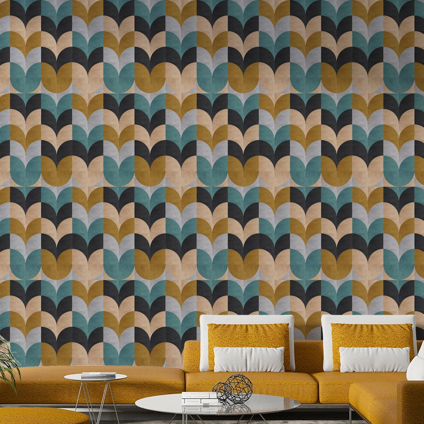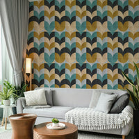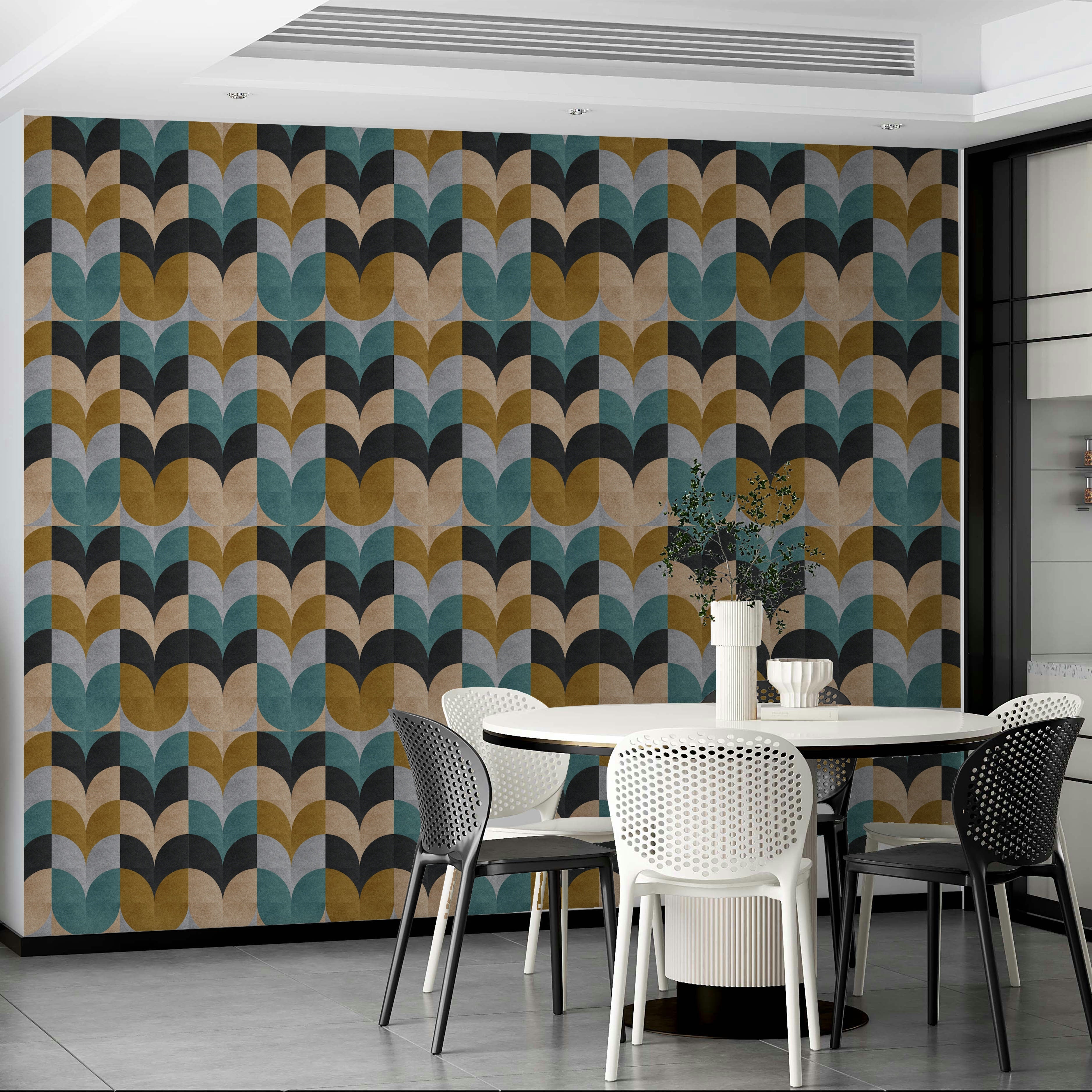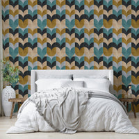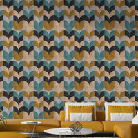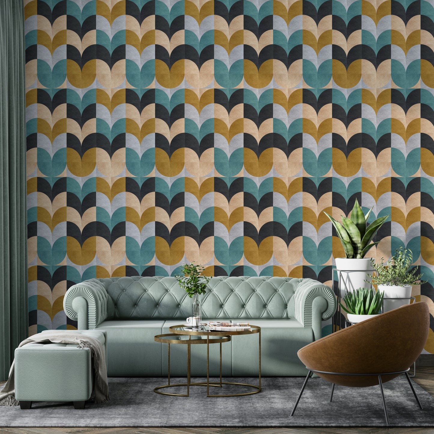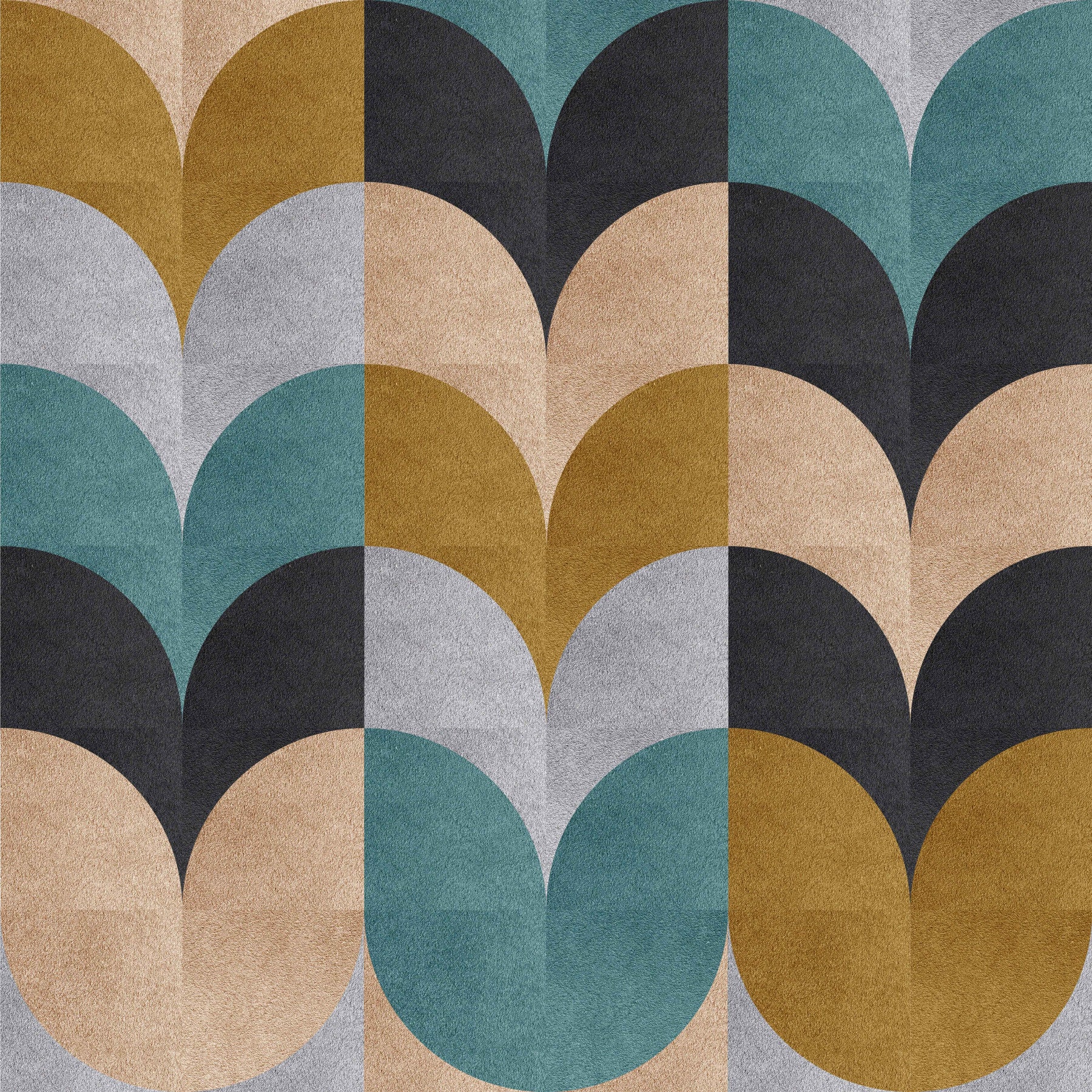 This stunning wallpaper showcases the elegance of geometric design. A sophisticated palette of muted gold, teal, grey, and black creates a calming yet visually rich composition. Interlocking, curved shapes reminiscent of stylized petals or leaves create a rhythmic, almost hypnotic pattern. The textured appearance of the colors adds depth and a tactile quality, enhancing the overall luxurious feel. This piece is a perfect blend of modern minimalism and artistic sophistication, ideal for adding a touch of refined style to any digital device.
