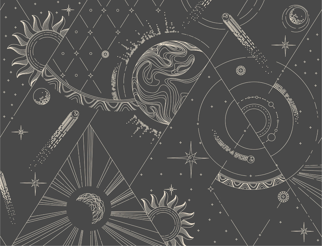 The abstract seamless pattern geometric grey colour mural wallpaper presents an astral-inspired design that blends celestial bodies and geometric lines into a harmonious composition. Crafted to captivate, this piece transforms a dining room into a space of cosmic elegance. The intricate artwork features stylized suns, planets, and orbit paths, all unified by a sleek grey colour scheme that exudes sophistication. Ideal for creating a focal point in any dining area, this abstract wallpaper, with its geometric patterns, invites diners to gaze into the depths of the universe. Its seamless design ensures a fluid continuity across walls, making it a stellar choice for those who appreciate the interplay of science and art in their surroundings.