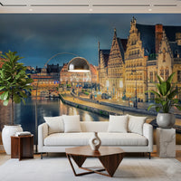 Bring the charm of Ghent to your walls with this stunning city view. The intricate architecture, illuminated buildings, and flowing river create a sophisticated ambiance. This wallpaper for walls features a rich colour palette of warm yellows, deep blues, and subtle browns. It works wonders in a living room or dining area, adding depth and character. The reflections on the water emphasise the tranquil setting. This wall décor enhances hallways, home offices, or any space craving a touch of European elegance. Its captivating composition makes a bold statement in modern and classic interiors.