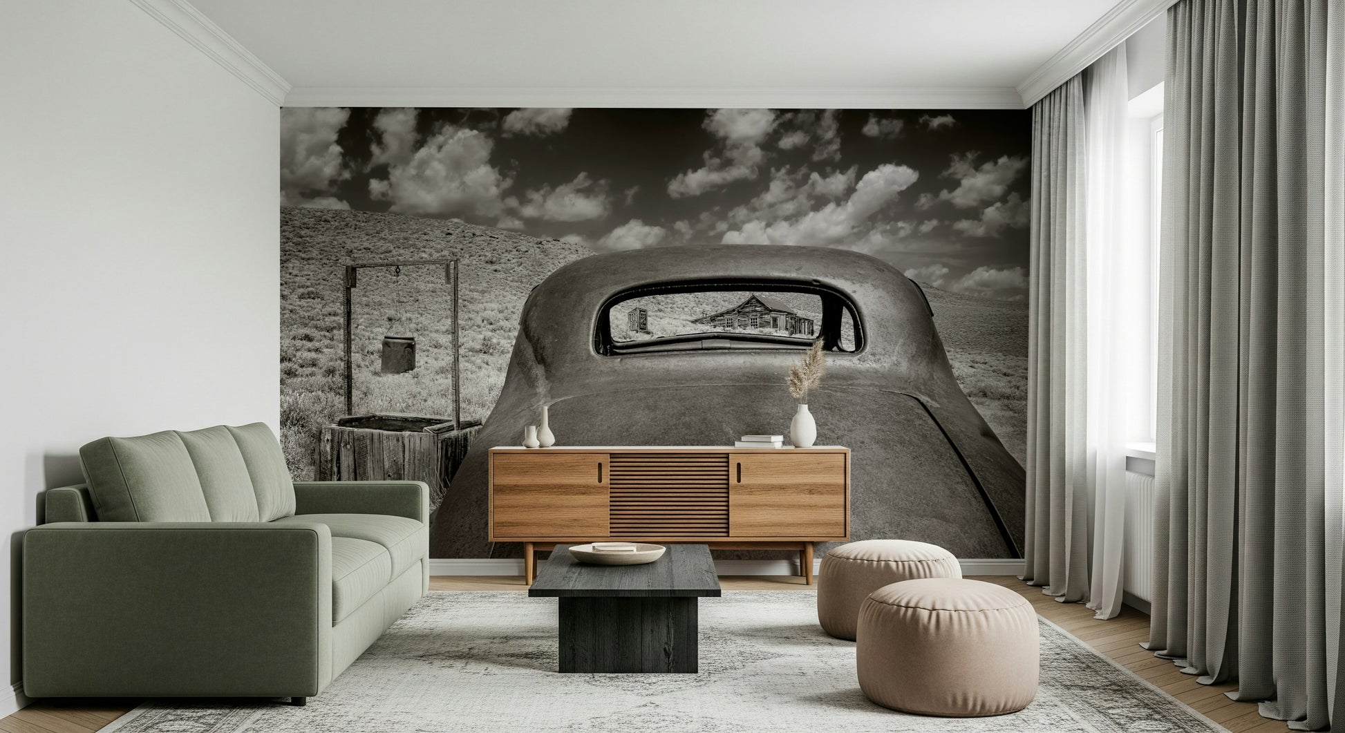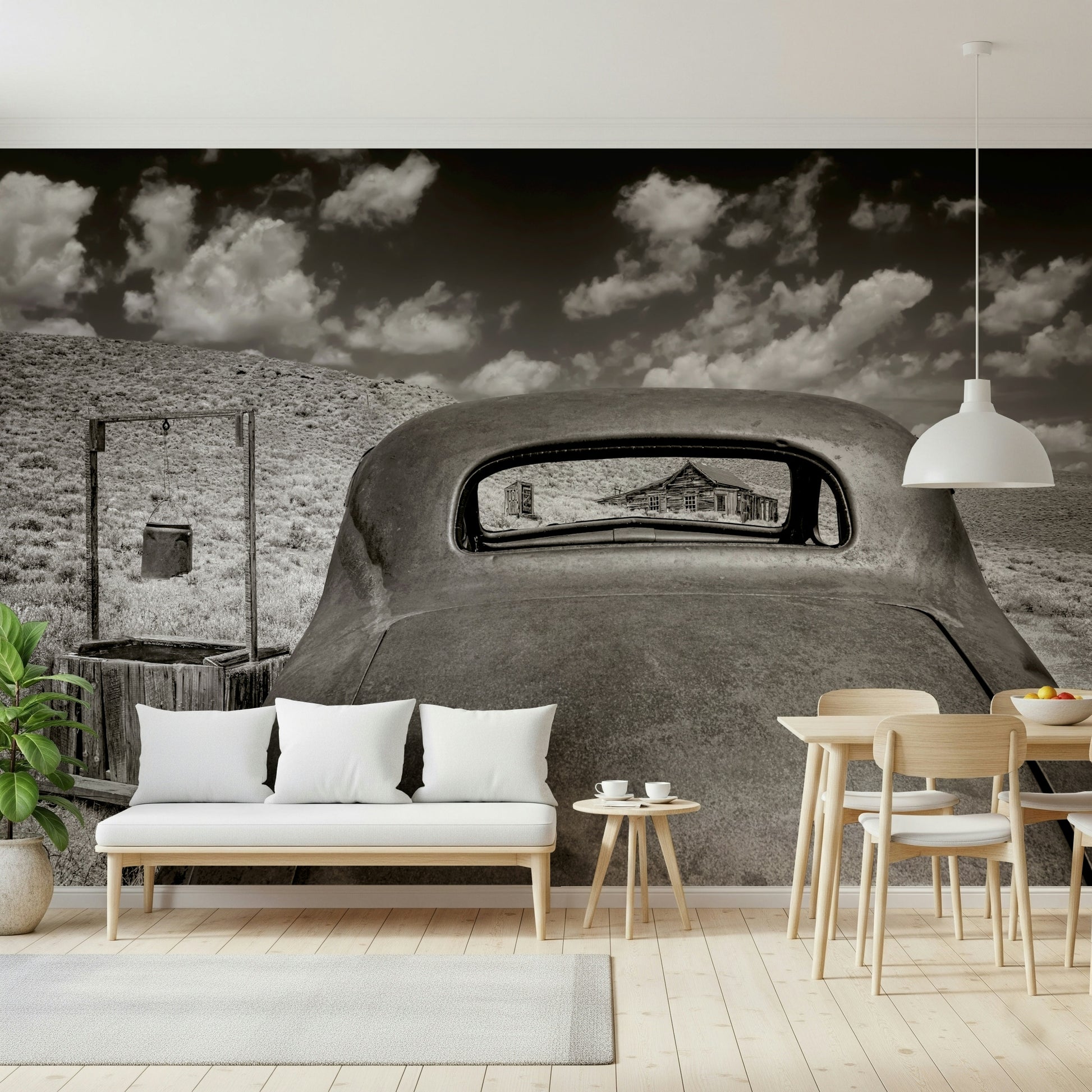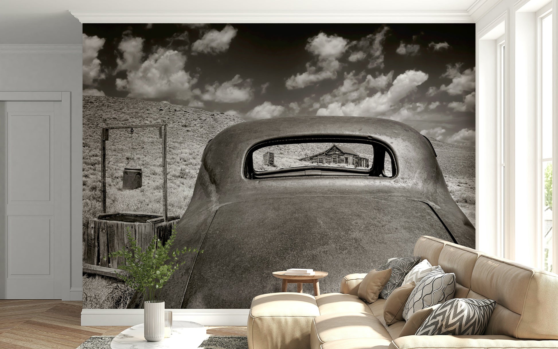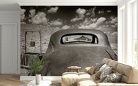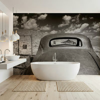 Capture a piece of forgotten history with this stunning black and white wallpaper for walls. The image presents a vintage car and a weathered building, creating a dramatic scene. The monochrome palette offers a sense of timelessness and can enhance any room. Consider this for an office, study, or living room. It adds a vintage industrial style and serves as a conversation starter, effortlessly complementing both classic and modern interiors.