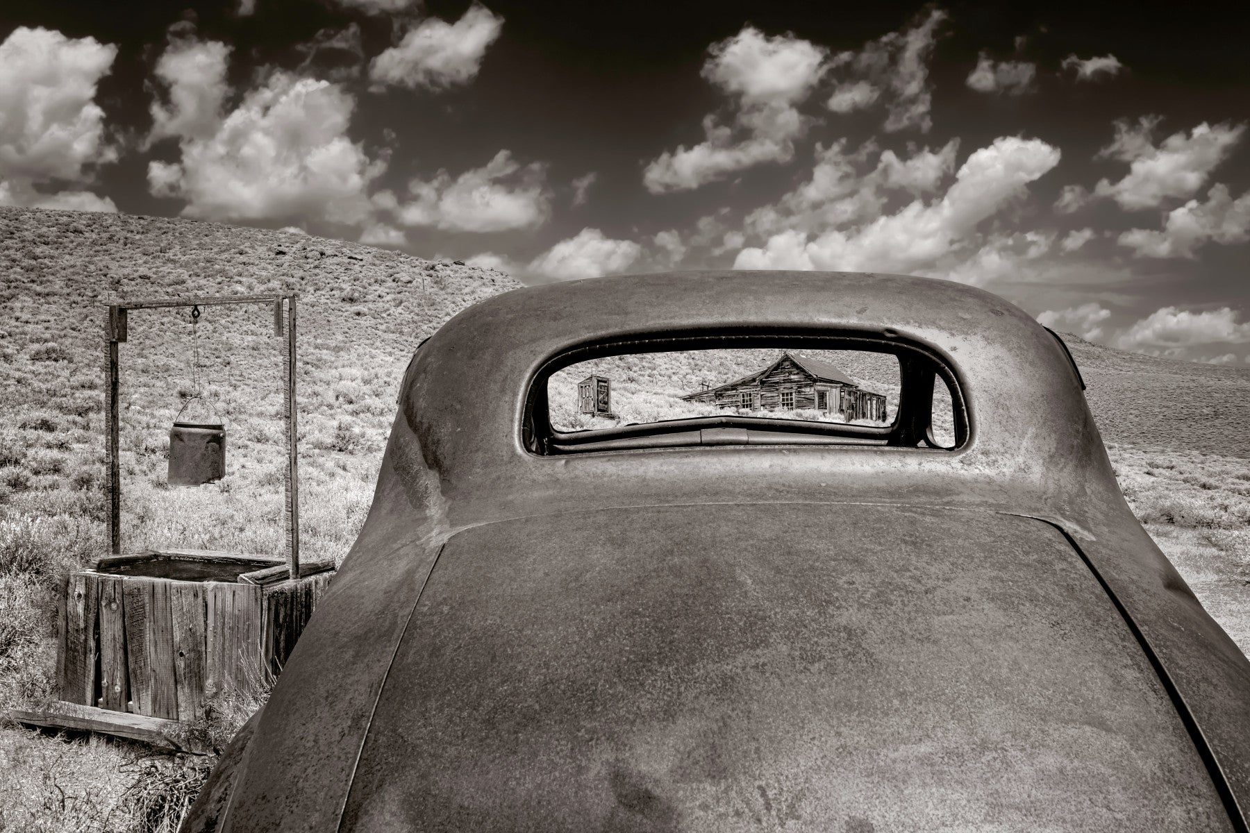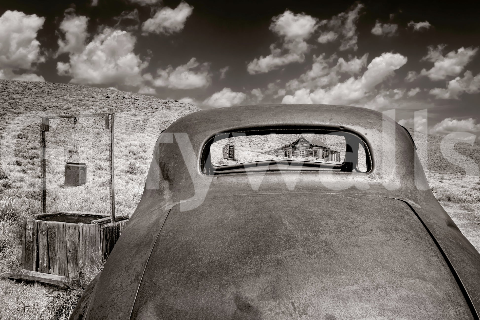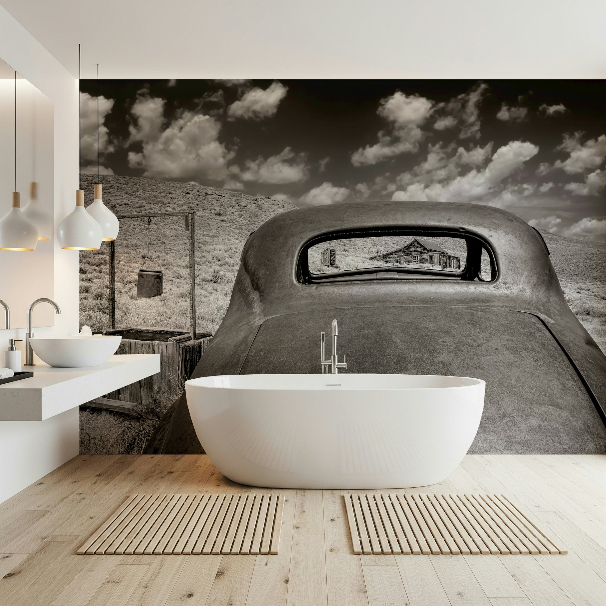 Capture a piece of forgotten history with this stunning black and white wallpaper for walls. The image presents a vintage car and a weathered building, creating a dramatic scene. The monochrome palette offers a sense of timelessness and can enhance any room. Consider this for an office, study, or living room. It adds a vintage industrial style and serves as a conversation starter, effortlessly complementing both classic and modern interiors.