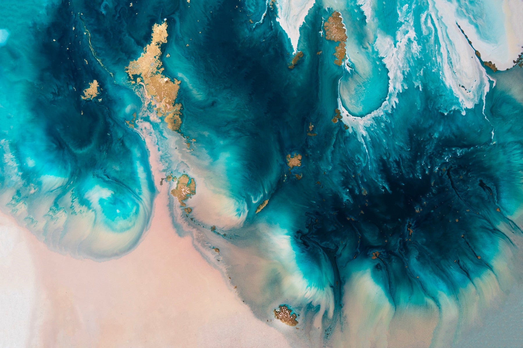 Immerse yourself in the fluid elegance of this abstract art wallpaper. The design features swirling shades of teal and deep blues, accented by touches of opulent gold. This wallpaper for walls brings a touch of modern luxury to any space. Imagine it transforming a living room into a serene sanctuary or adding a sophisticated touch to a bedroom. Let this striking design complement your interiors and spark conversations.