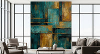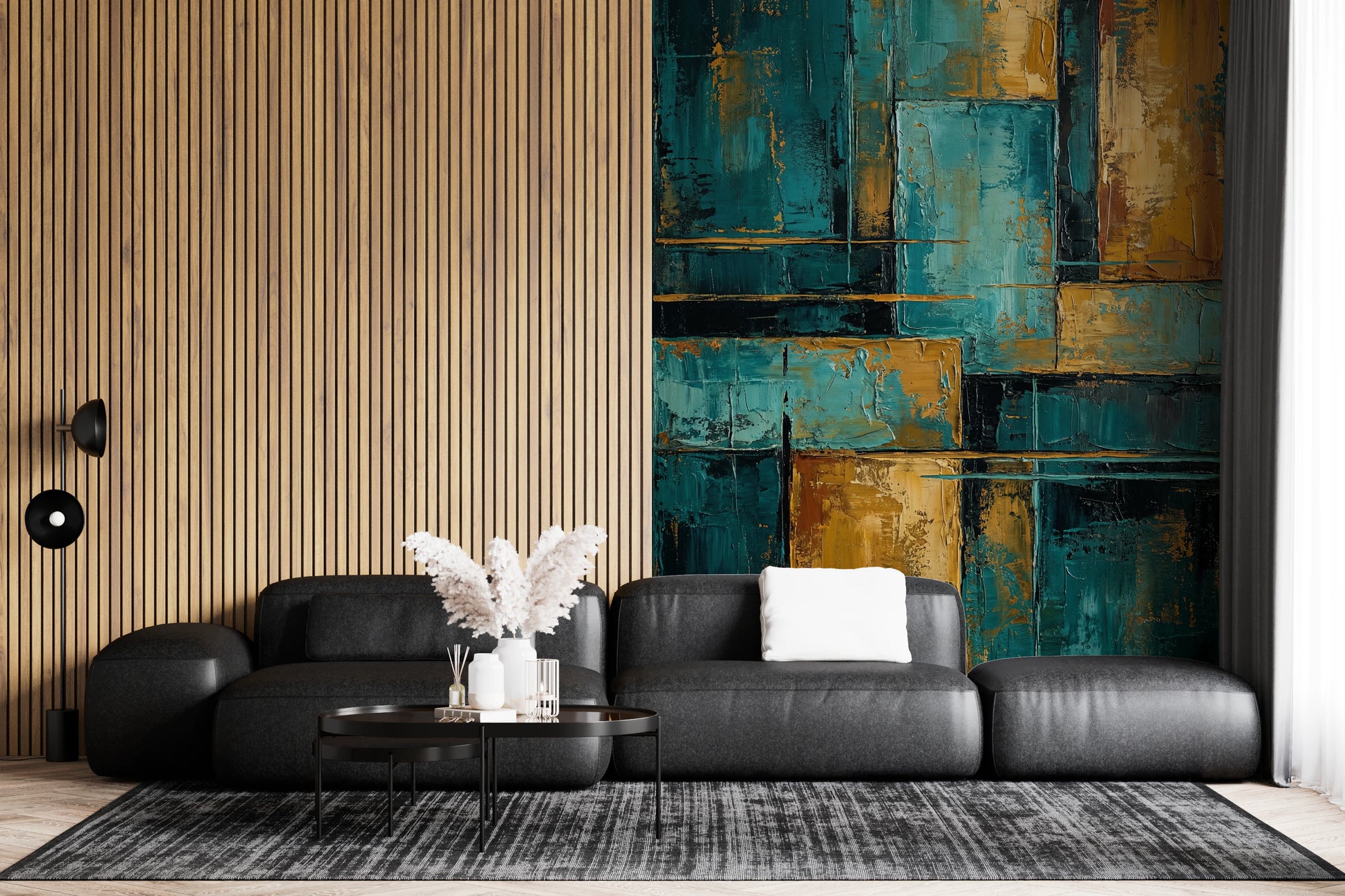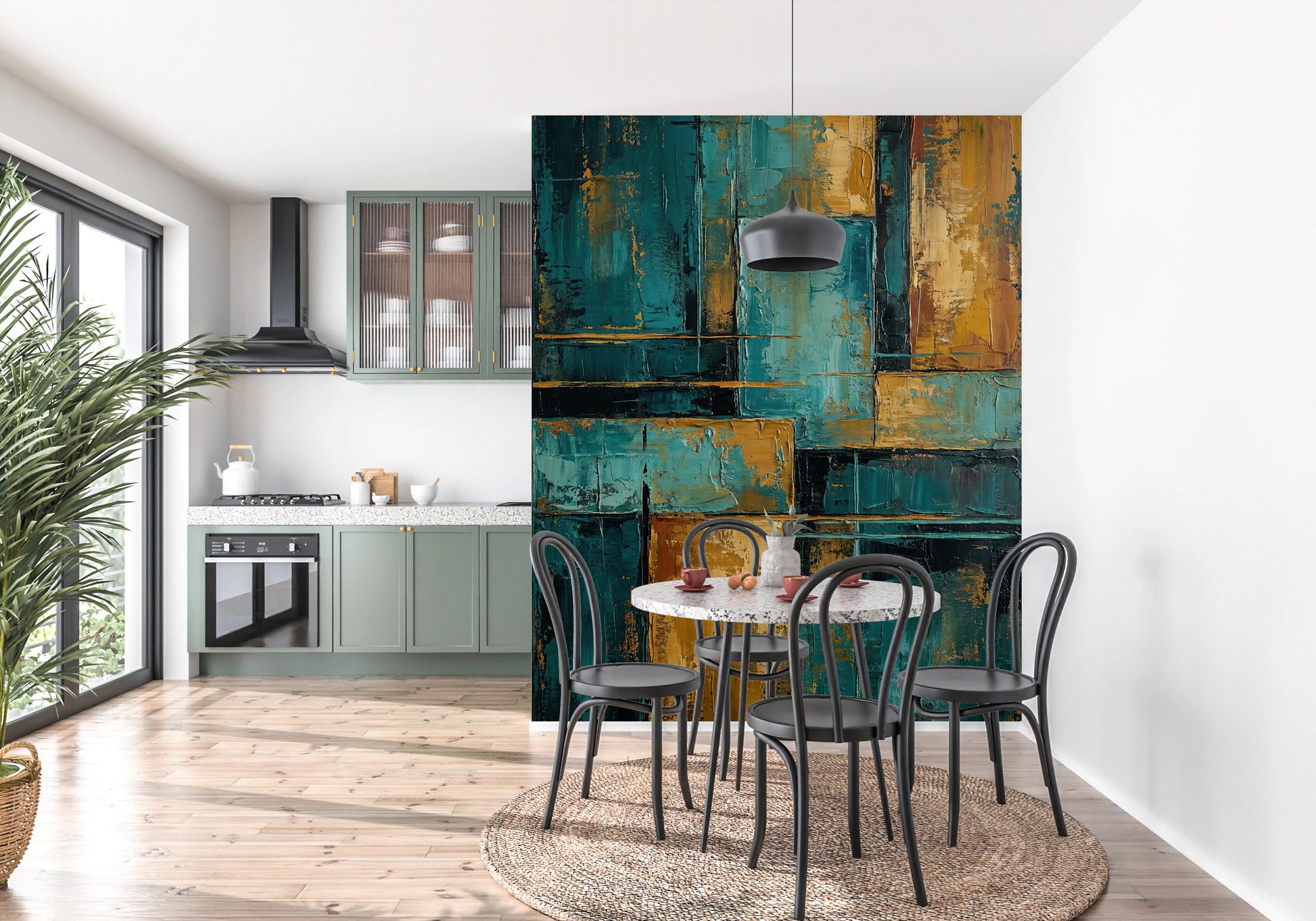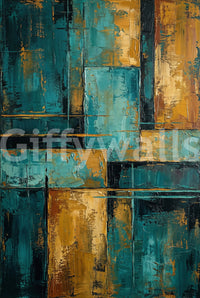 Invite artistry into your home with this striking wallpaper for walls. Its abstract design features bold brushstrokes in a grid-like pattern, creating a modern and sophisticated statement. Teal and gold hues interplay beautifully, lending an air of luxury and depth to any room. The design complements spaces from living rooms and dining areas to hallways and home offices. Introduce visual interest and a focal point with this eye-catching piece. This wallpaper effortlessly elevates the ambience and sets a sophisticated tone.