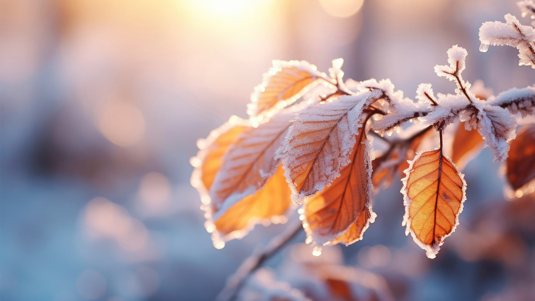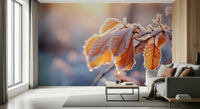 Capture the magic of a frosty morning with this stunning image. Glistening ice crystals line delicate leaves, catching the light in a dance of colour. The blend of cool blues and warm oranges offers visual depth, making this wallpaper for walls ideal for any space needing a touch of tranquility. The delicate details and soft light will transform a bedroom into a serene sanctuary. Consider it also for hallways or living rooms to add a sophisticated natural element.