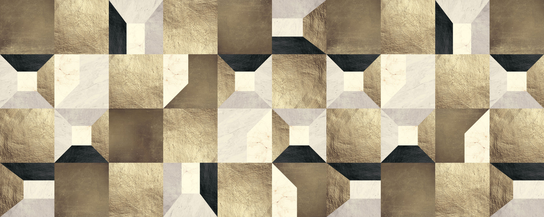 A modern wall mural with a repeating geometric pattern and a gilded effect.