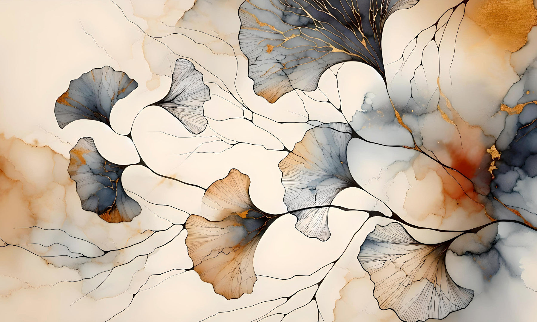 Detailed view of the veins and textures on a golden ginkgo leaf mural.