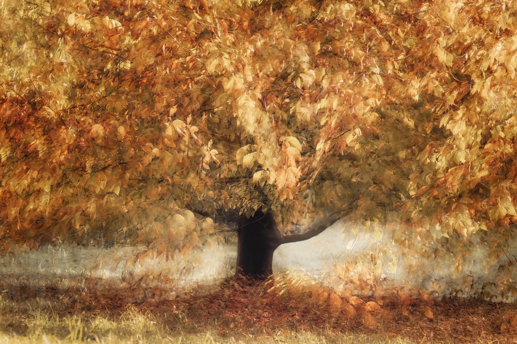 Enhance your home with this rich and inviting wallpaper for walls. A large autumn tree presents warm tones of gold and brown. The wallpaper gives the impression of sunlight filtering through the leaves. This design works beautifully in living rooms, bedrooms, or dining rooms. The effect complements interiors by adding a touch of nature’s grandeur, working well with both modern and traditional decor styles.