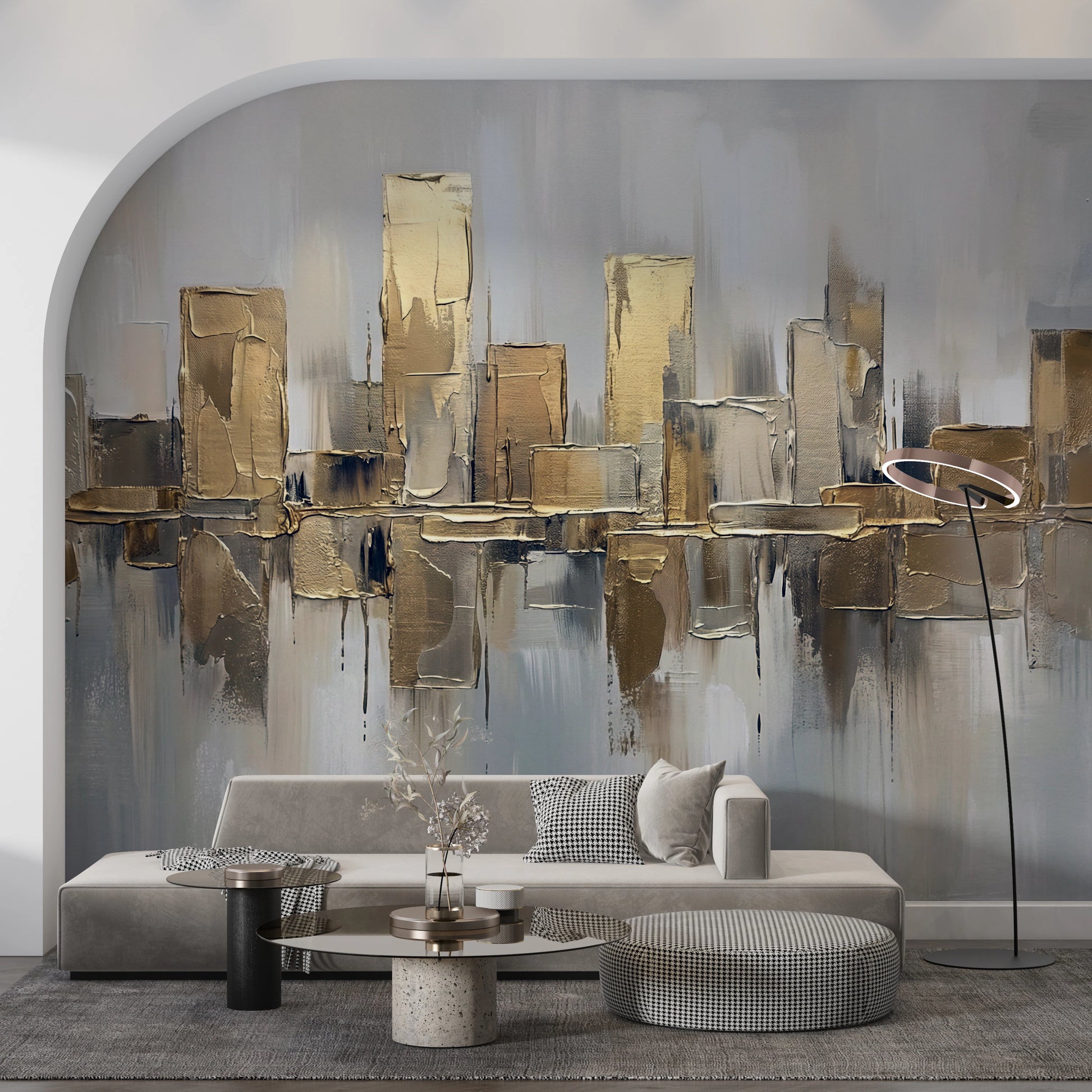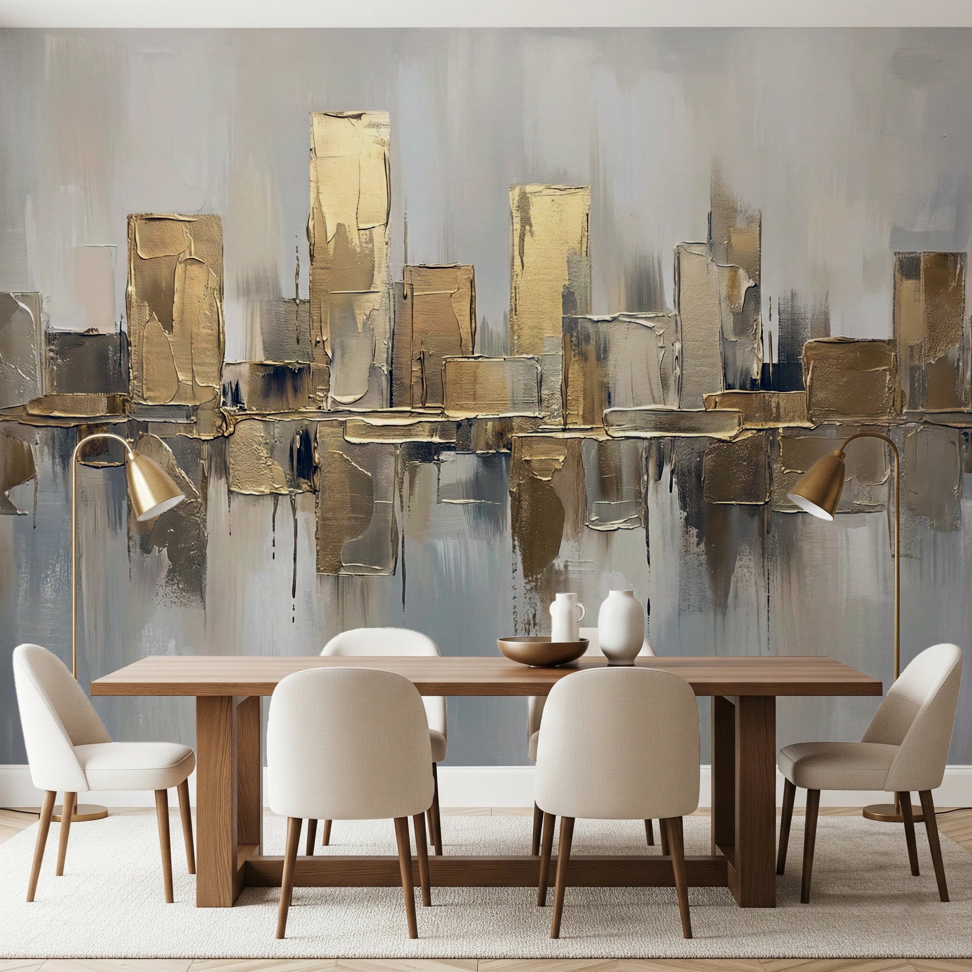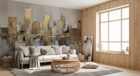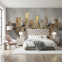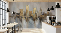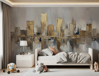 Transform your living space with this sophisticated abstract cityscape. A palette of warm golds and cool greys creates a luxurious feel, ideal for modern interiors. Thick brushstrokes give the impression of textured surfaces, adding depth and visual interest to your walls. Consider this design for living rooms, dining areas, or home offices where you want to make a subtle statement. This wallpaper for walls adds a touch of refined elegance and works well to complement neutral or minimalist decor styles. It brightens your interior and also adds a modern, stylish flair.