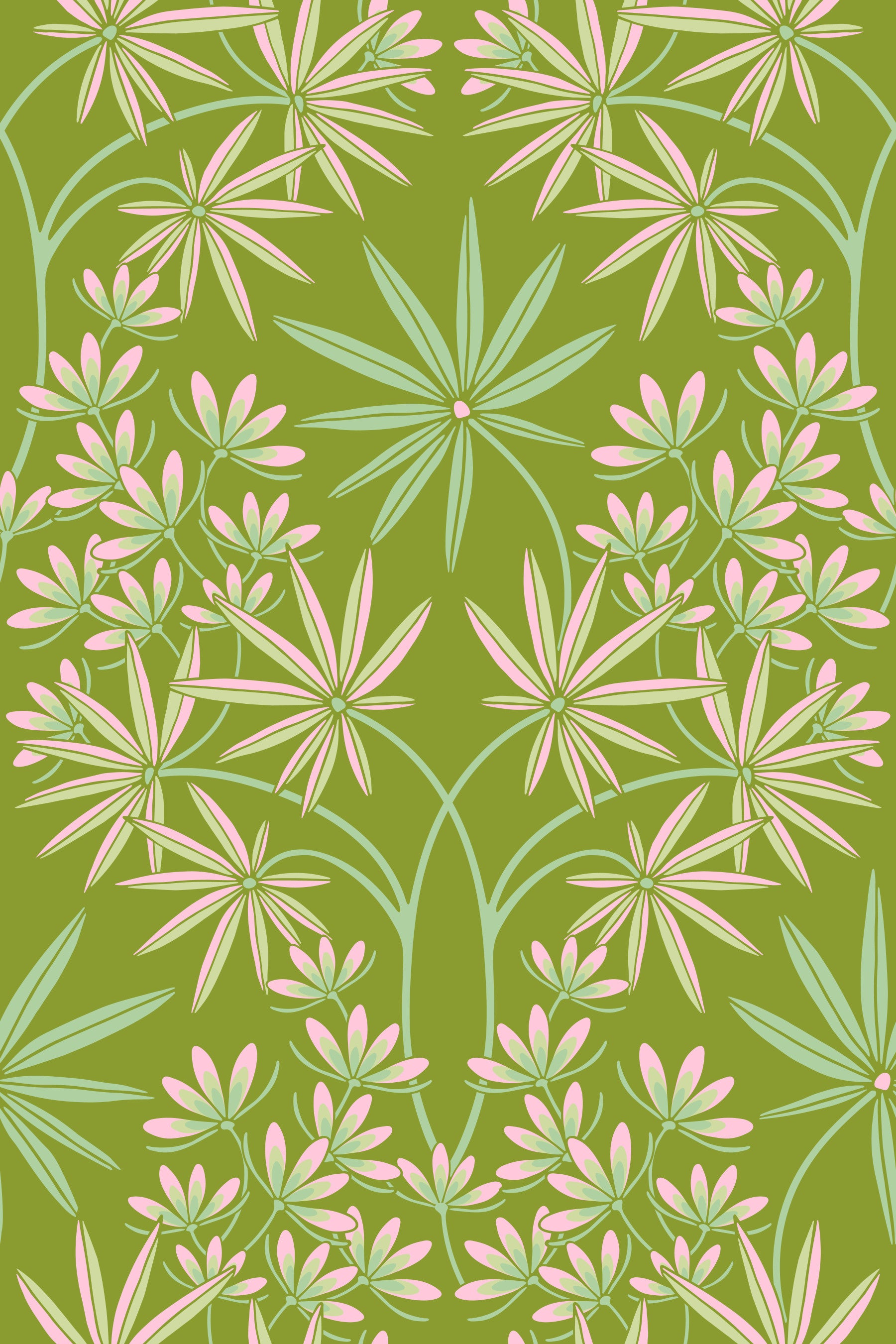 Immerse yourself in the gorgeous opulent world of this Glamour floral damask wallpaper in a Cottage Spring Green colourway reminiscent of Old Hollywood. This floral tropical botanical pattern is an unapologetic celebration of Maximalism, referencing both Art Nouveau and opulent Jazz Age style, featuring pink, light green and chartreuse flowers and tropical leaves on a spring green background in a delicate lacy damask layout. The symmetrical arrangement creates a sense of formal elegance, typical of damask patterns, with an exaggerated scale and exuberant color palette that is perfect for adding a touch of fresh energy to any space. This pattern design is also available in Other Colourways too! Original wallpaper pattern design by Jackie Tahara of UnBlink Studio.