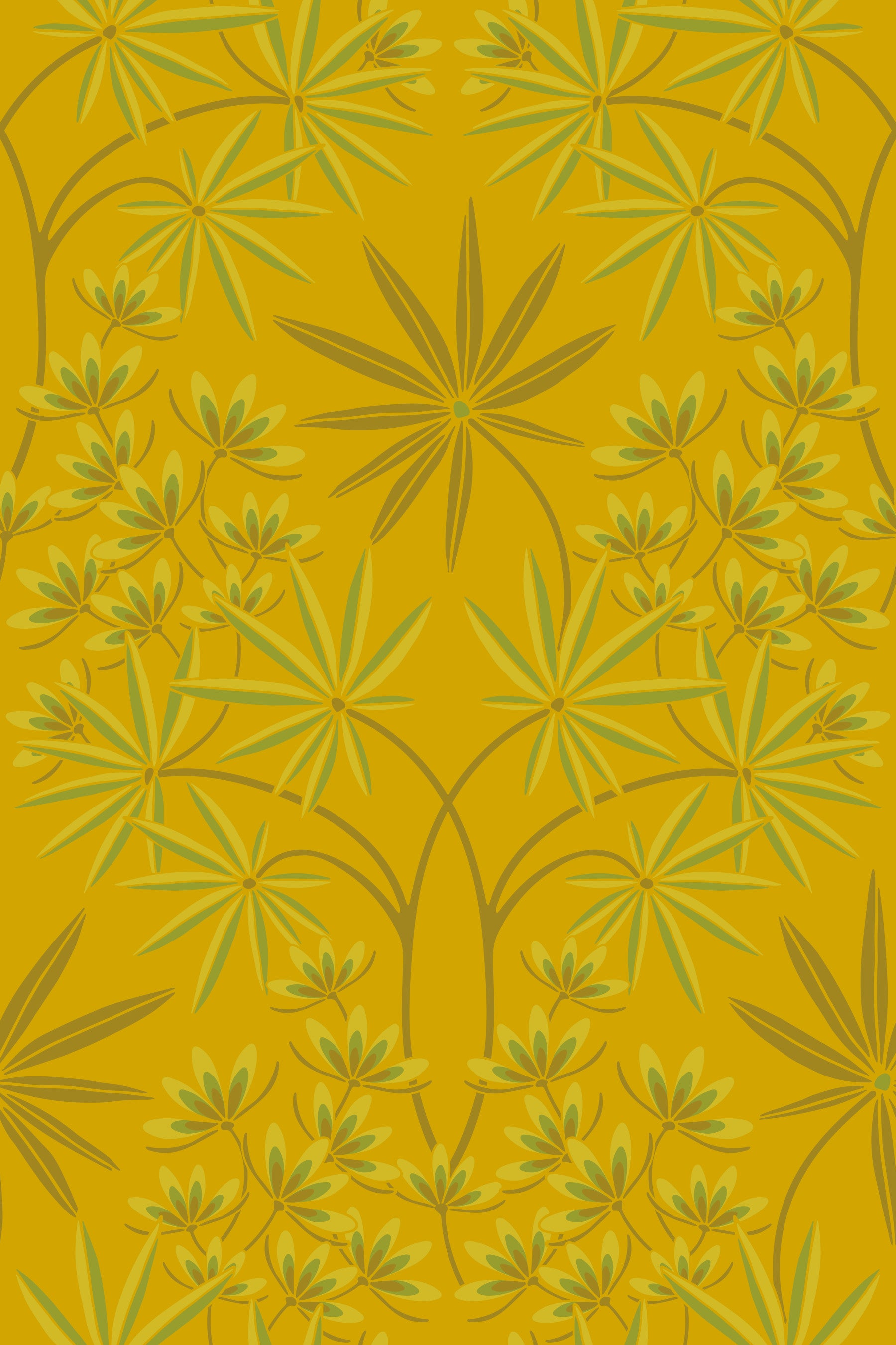 Immerse yourself in the gorgeous opulent world of this Glamour floral damask wallpaper in a Deep Yellow colourway reminiscent of Old Hollywood. This floral tropical botanical pattern is an unapologetic celebration of Maximalism, referencing both Art Nouveau and opulent Jazz Age style, featuring green, olive brown and bright yellow flowers and tropical leaves on a deep yellow background in a delicate lacy damask layout. The symmetrical arrangement creates a sense of formal elegance, typical of damask patterns, with an exaggerated scale and exuberant color palette that is perfect for adding a touch of high-fashion drama to any space. This pattern design is also available in Other Colourways too! Original wallpaper pattern design by Jackie Tahara of UnBlink Studio.