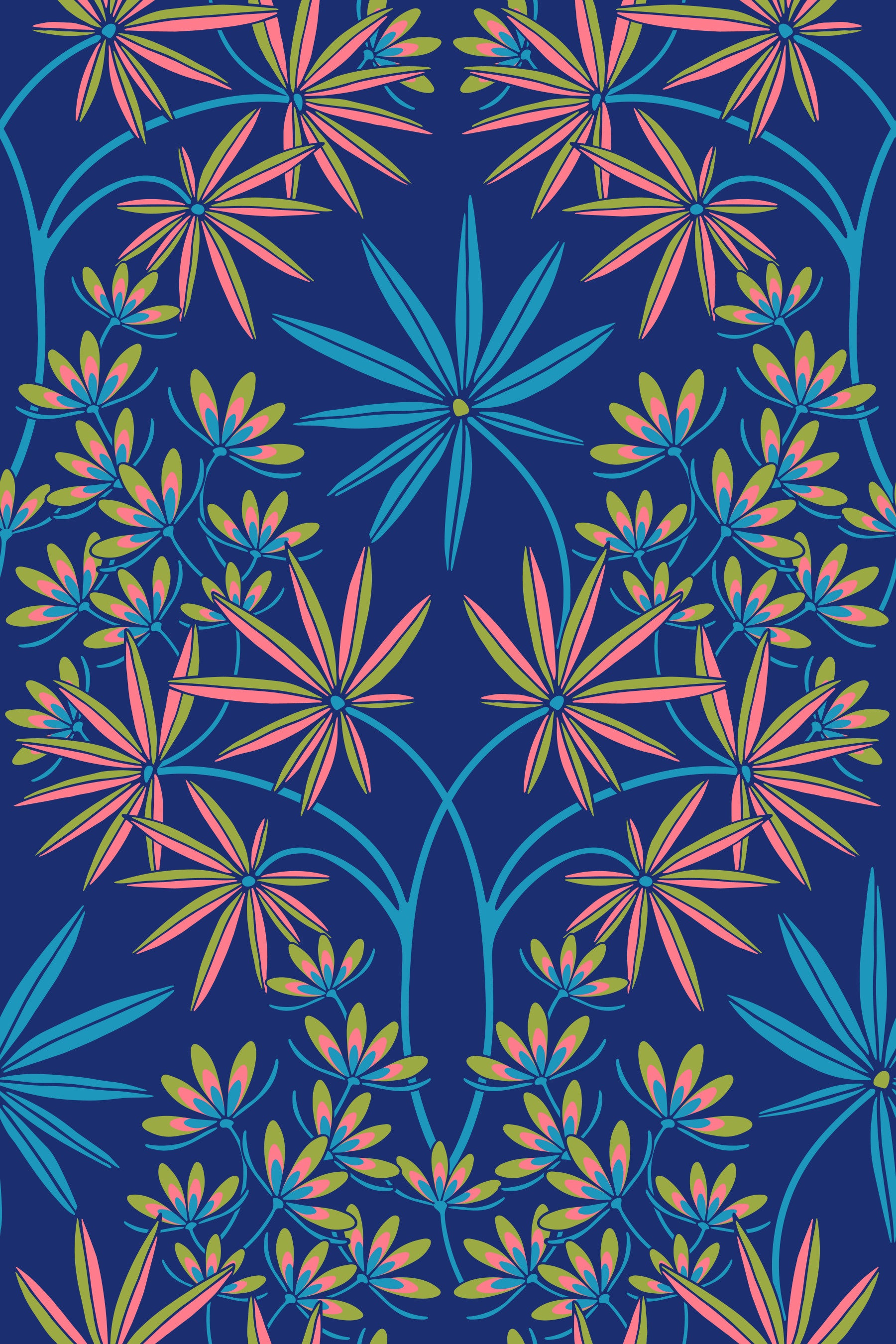 Immerse yourself in the gorgeous opulent world of this Glamour floral damask wallpaper in a Royal Blue colourway reminiscent of Old Hollywood. This floral tropical botanical pattern is an unapologetic celebration of Maximalism, referencing both Art Nouveau and opulent Jazz Age style, featuring salmon pink, olive green and blue flowers and tropical leaves on a royal blue background in a delicate lacy damask layout. The symmetrical arrangement creates a sense of formal elegance, typical of damask patterns, with an exaggerated scale and exuberant color palette that is perfect for adding a touch of high-fashion drama to any space. This pattern design is also available in Other Colourways too! Original wallpaper pattern design by Jackie Tahara of UnBlink Studio.