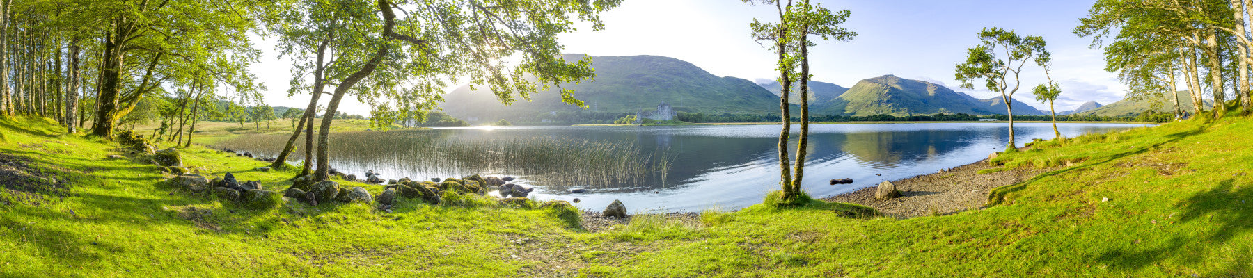 Kilchurn Castle, Loch Awe, Scotland. Escape to the Scottish Highlands with this serene wallpaper. Glimpses of a castle peek through the tree line, hinting at stories of old. Fresh green colours breathe life into your interior, while a calm lake and majestic mountains complete the tranquil picture. This wallpaper for walls makes a striking feature in any living space. Imagine waking up to this beautiful view in your bedroom or inviting tranquility to your home office. It pairs wonderfully with nature inspired decor.