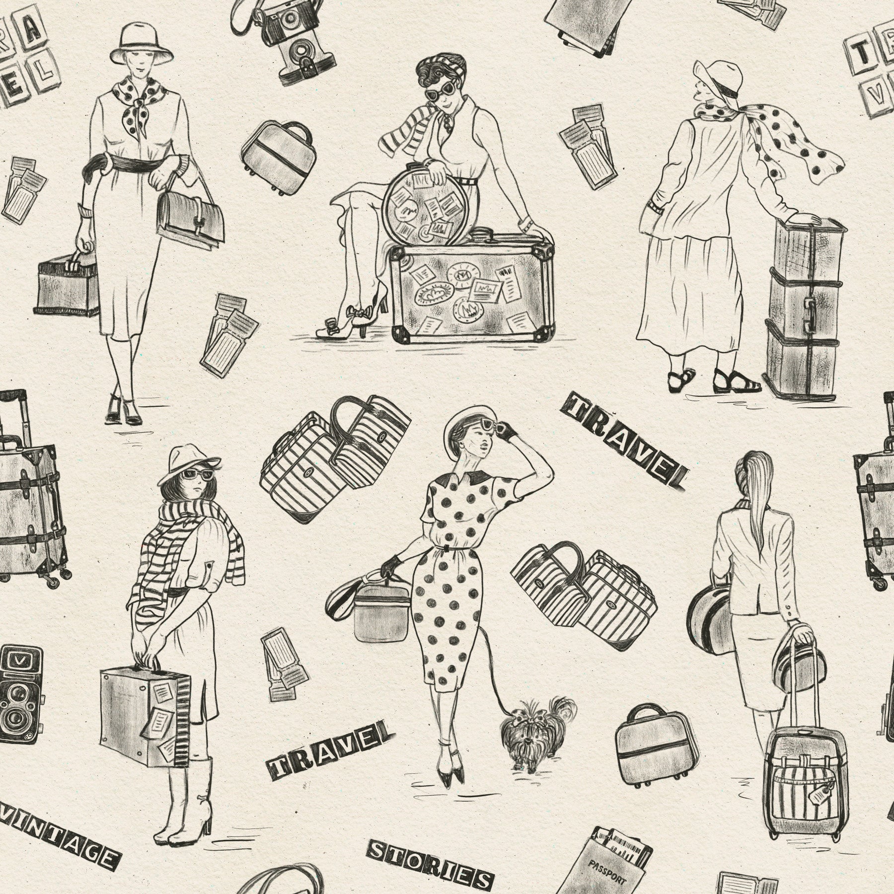 Let your walls tell a story of travel and timeless style. The design features chic travellers and vintage suitcases in a pencil sketch style, presented in a monochromatic palette. The pattern and design are suitable for a bedroom, hallway, or home office. With its neutral tones and sophisticated design, this wallpaper for walls enhances interiors, creating a focal point of interest and conversation.